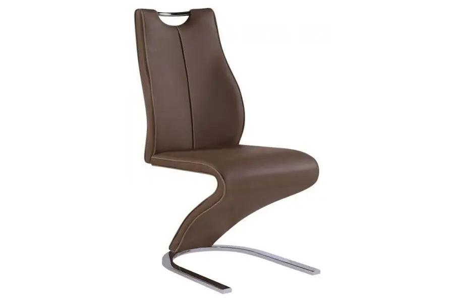Las sillas laterales están tapizadas en cuero sintético marrón y presentan un diseño en forma de Z, un perfil elegante con respaldo alto que sujeta el cuerpo mientras come, y una base cromada en forma de U que añade un toque arquitectónico único a la colección. Para completar su comedor, el aparador ofrece amplio espacio de almacenamiento y estilo.