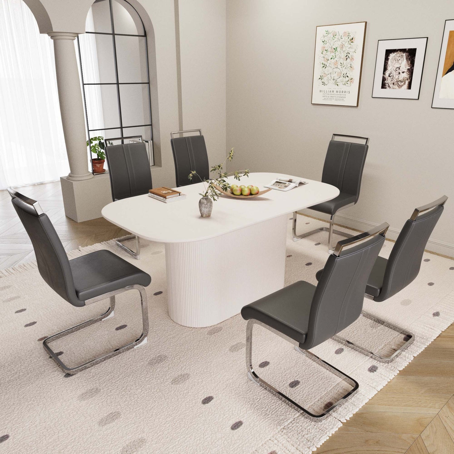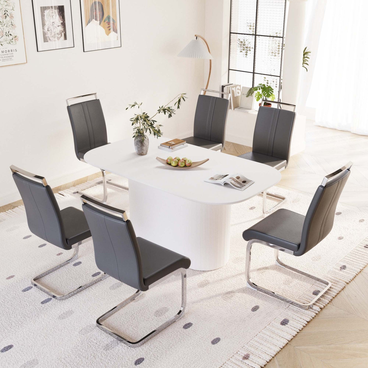 - Juego de mesa y sillas de comedor de 2,7 piezas: una mesa que puede acomodar de 4 a 8 invitados para reuniones y 6 sillas de comedor sin brazos de estilo moderno de cuero diseñadas ergonómicamente, creando un foco de moda para usted en el comedor.