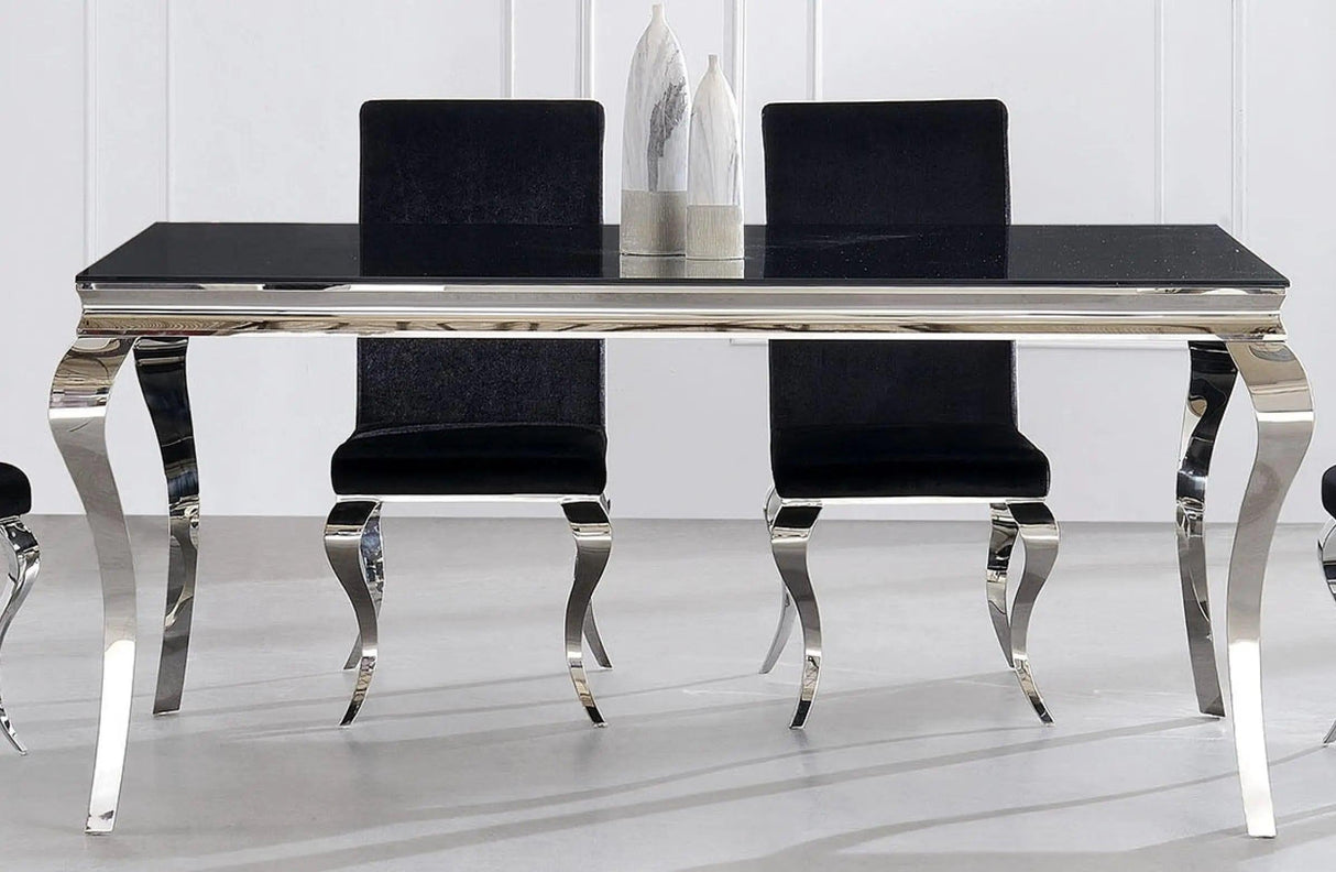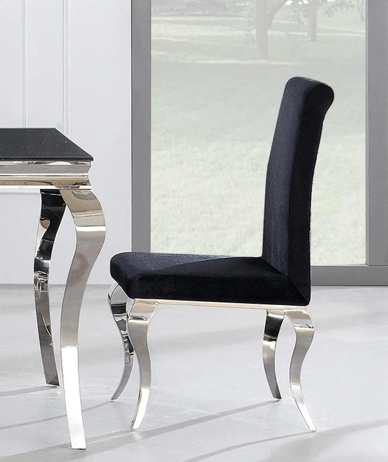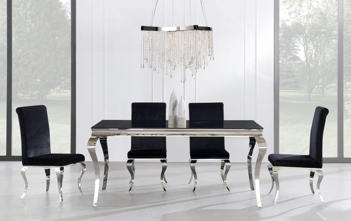 Mesa de comedor moderna de inspiración neoclásica con tablero de vidrio negro, base de acero inoxidable pulido y patas de acero inoxidable estilo Queen Ann. Esta mesa contemporánea con tablero de vidrio negro complementará cualquier comedor. Cuenta con un tablero rectangular de vidrio templado, patas plateadas en forma de V y una base negra brillante que le da un aspecto sofisticado. La silla de comedor D858DC de terciopelo negro luce un estilo encantador con su respaldo alargado, asiento ancho y patas de transición en una estructura de acero inoxidable. La simplicidad, la esencia del diseño, es su principal atractivo. Se integra con cualquier ambiente gracias a sus colores tenues y líneas modernas. Con un diseño y una calidad excepcionales, esta silla de comedor es ideal para los amantes del hogar. El juego de comedor D858DT/D858DC de 5 piezas en negro ofrece una alternativa de diseño moderno para su cocina, comedor o cafetería. Presenta un diseño contemporáneo.