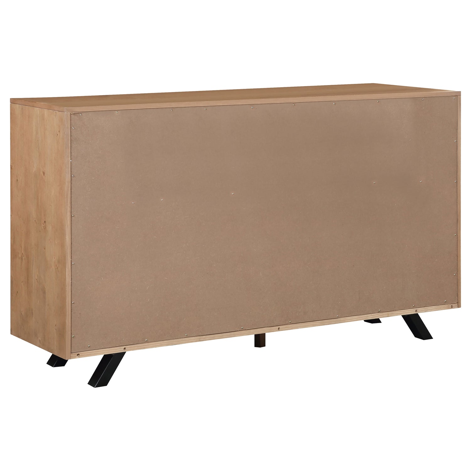 Ofrezca un amplio espacio de almacenamiento y una estética discreta y elegante con este juego de dormitorio contemporáneo, que incluye una cama de inspiración rústica, muebles de almacenaje y un espejo con marco en un acabado neutro marrón miel claro. Los herrajes en bronce mate en contraste y las patas con un ángulo pronunciado aportan un toque final y un diseño impactante. Un espejo biselado con marco completa su dormitorio moderno, creando un tocador y una pared central según sus necesidades.