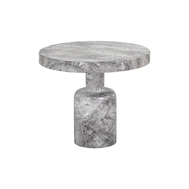 Una mesa auxiliar clásica y elegante con un diseño elegante. Presenta un tablero redondo con base curva en hormigón con acabado imitación mármol gris a juego. También disponible una mesa de centro a juego.