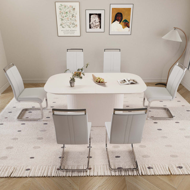 Mesa de comedor de MDF estilo crema medieval moderno de 63 'y juego de sillas de comedor sin brazos de PU 6. Juego de sillas de comedor con patas de metal plateado y escritorio ensamblado, adecuado para el hogar y la cocina.