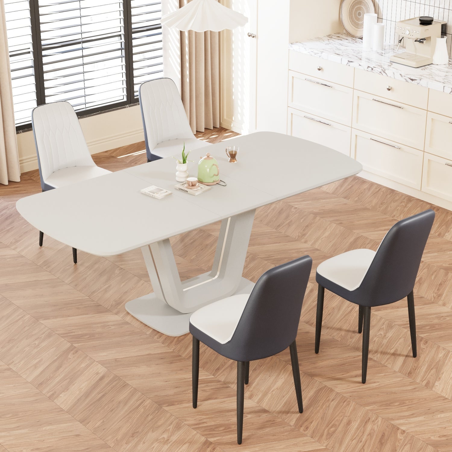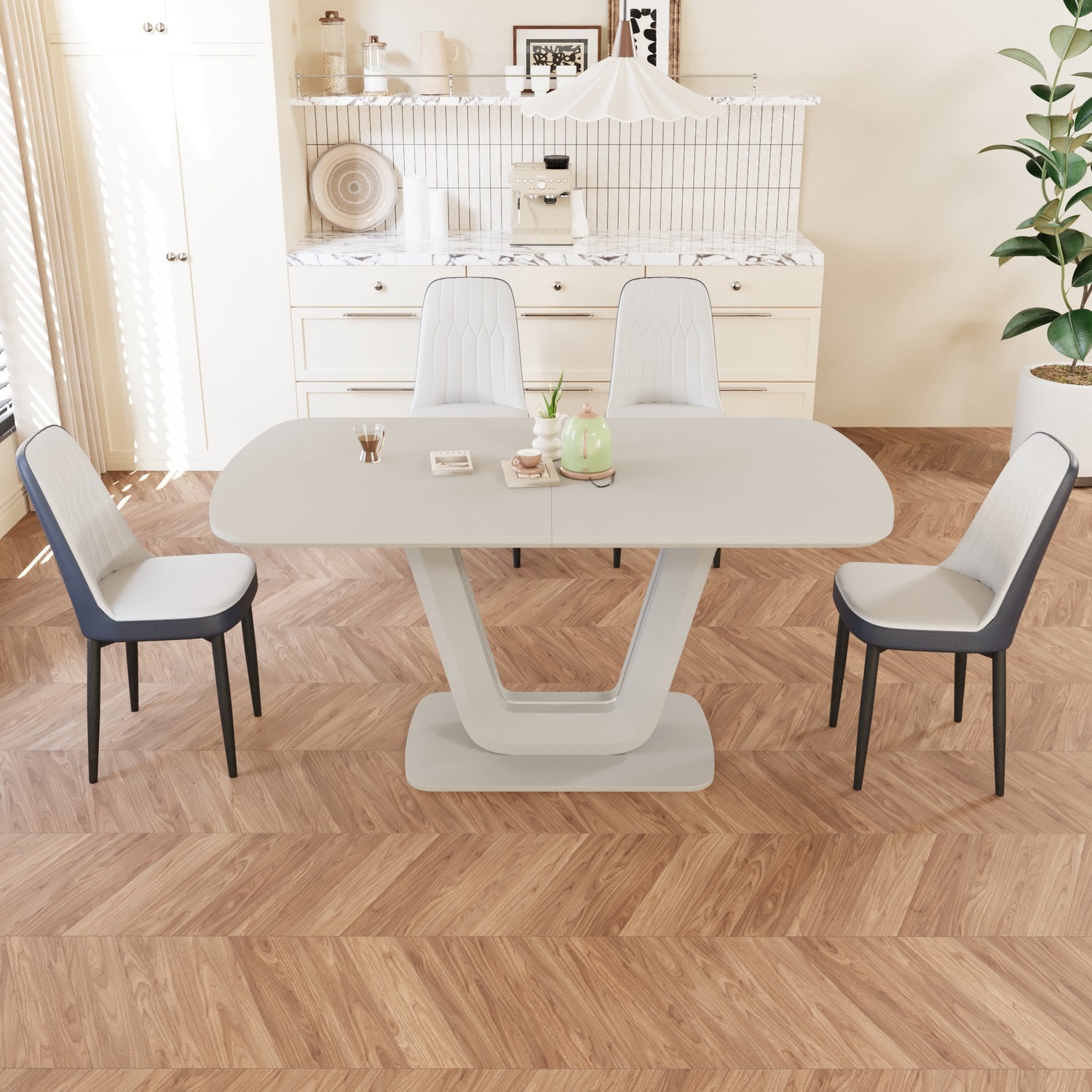 Juego de mesa de comedor expandible de 62,99 a 78,74 pies para 2 a 8 personas, equipado con 4 sillas de comedor acolchadas gruesas de tela de PU y una espaciosa mesa de comedor, mesa de cocina y sillas, con patas de mesa en forma de U