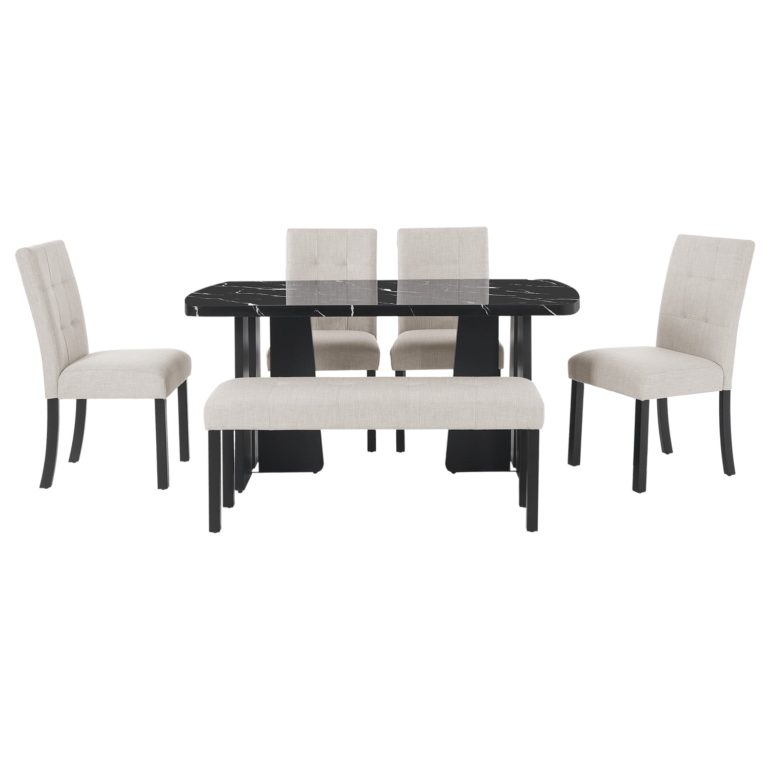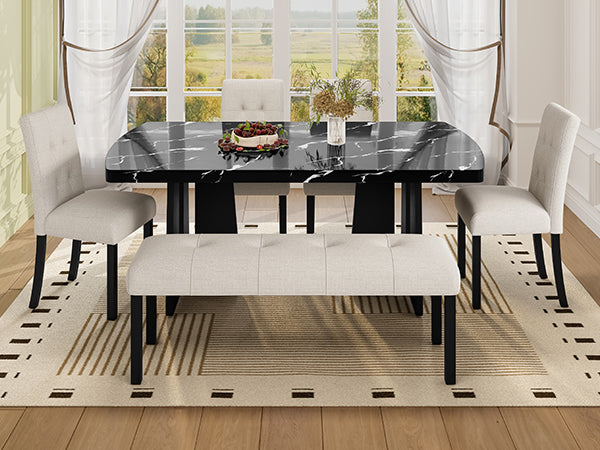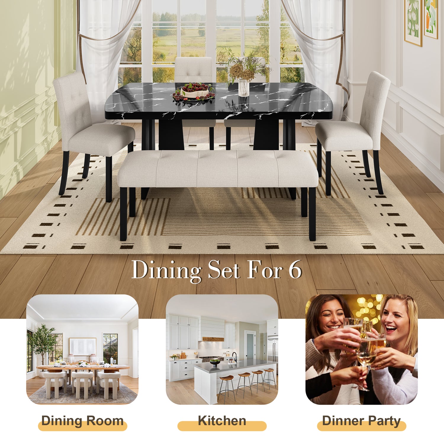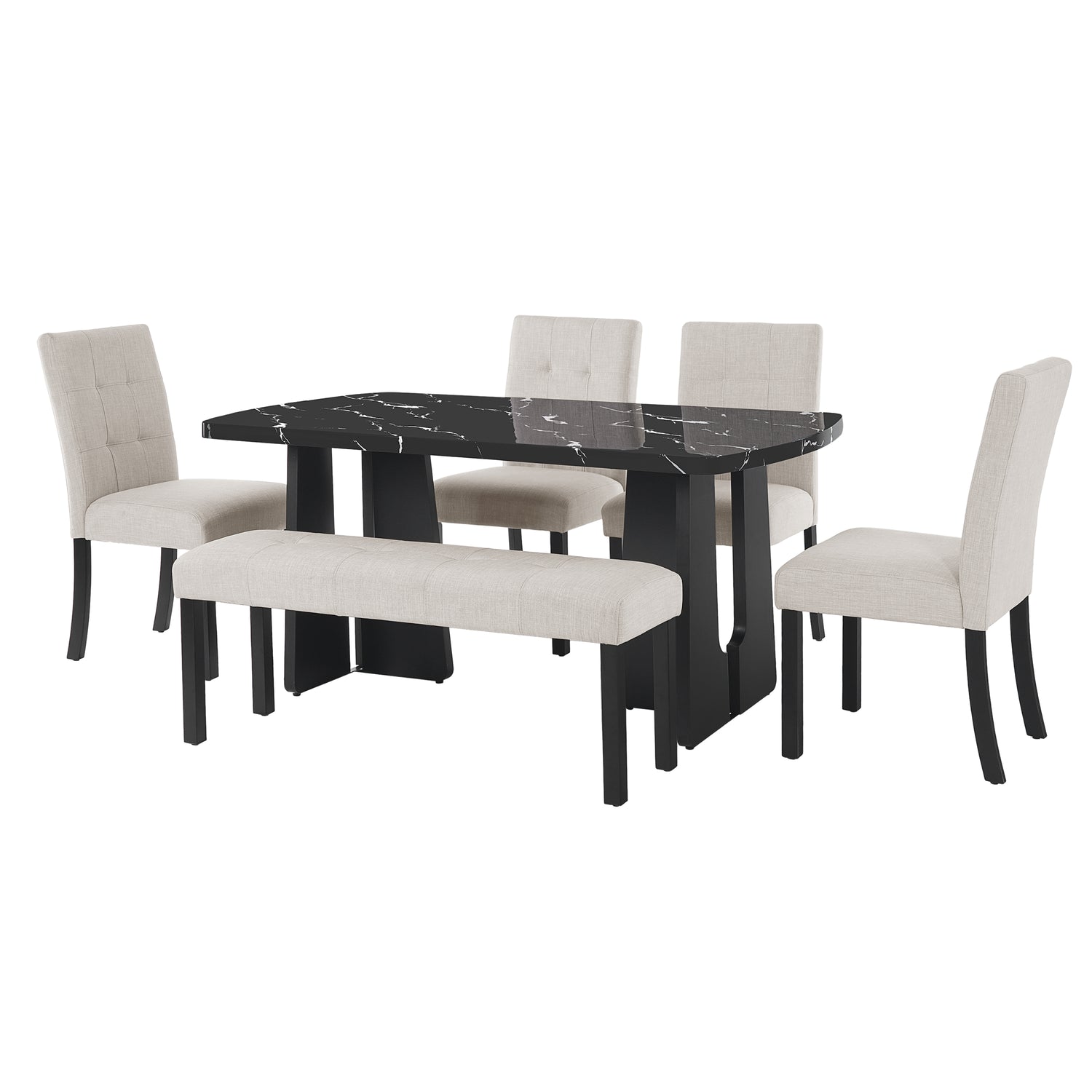 Juego de mesa de comedor moderna de 6 piezas, mesa de comedor de imitación mármol de 16 m con patas geométricas, 4 sillas tapizadas y 1 banco, ideal para comedor o cocina, fácil de montar, beige y negro.