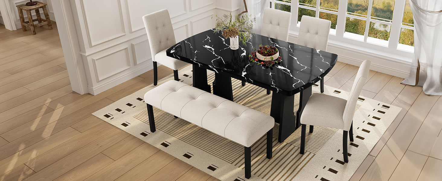 - Material de primera calidad: La mesa de comedor cuenta con un tablero de imitación mármol con núcleo de MDF, que ofrece la lujosa apariencia del mármol natural, además de ser resistente a arañazos, manchas y calor. Las patas de la mesa, las patas de las sillas y las patas del banco están fabricadas con madera de caucho. Esta combinación de materiales no solo garantiza durabilidad, sino que también facilita el mantenimiento del conjunto: simplemente limpie la superficie de imitación mármol y limpie las patas de madera de caucho para una apariencia renovada.