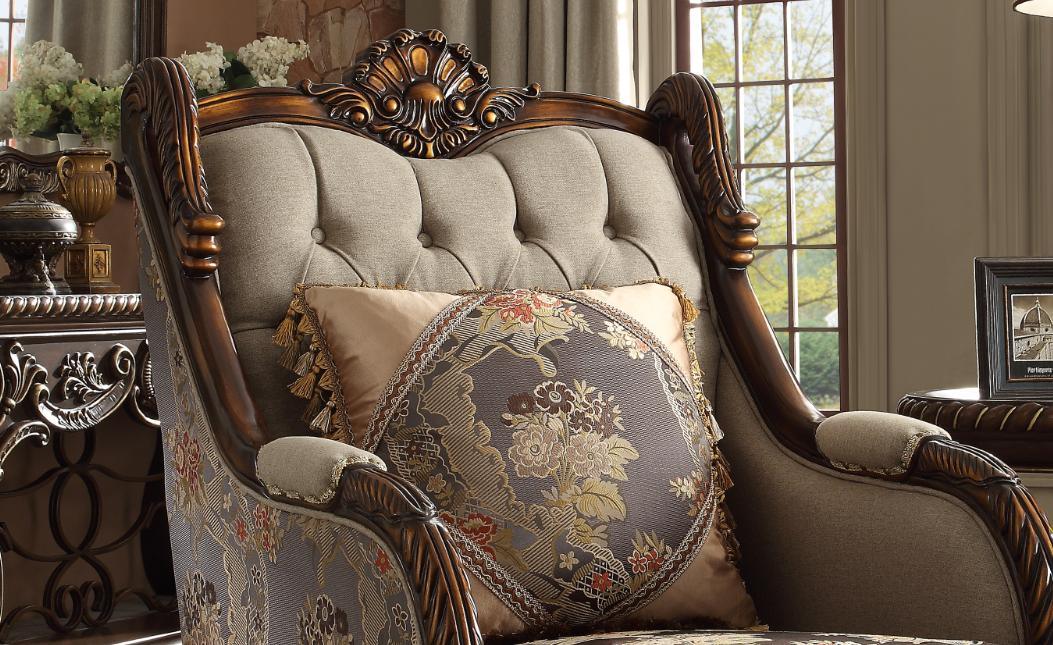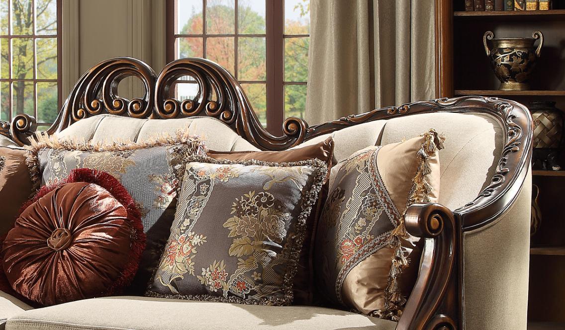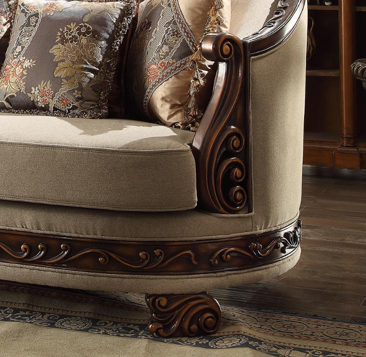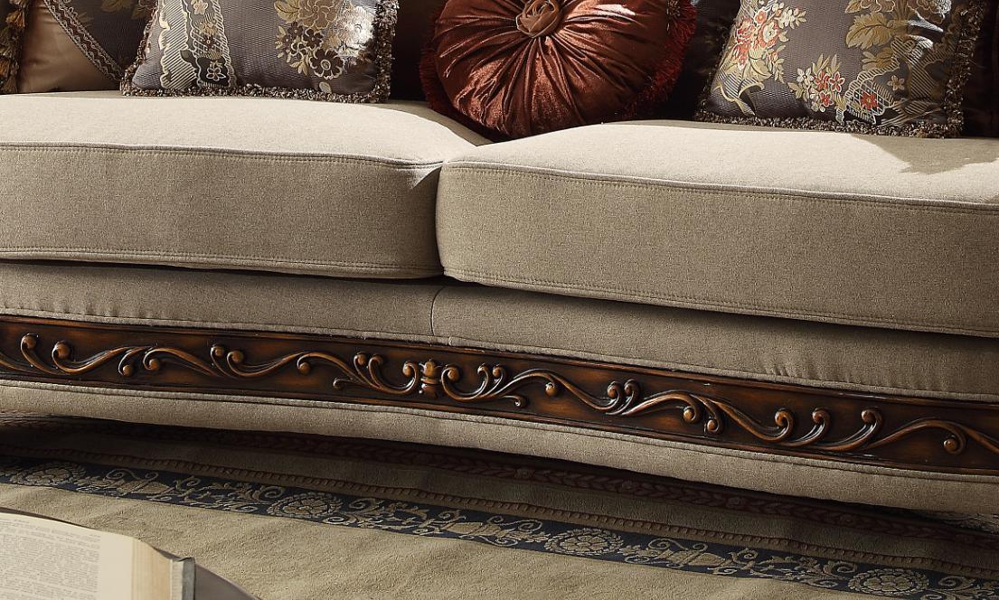 Juego de sala con tapizado tradicional beige de Homey Design. Invierta en un ambiente armonioso con el juego de sala tradicional HD-1623 de Homey Design. Diseñado para ofrecer lo mejor en comodidad y durabilidad, este juego de sala está tapizado con tela de chenilla de primera calidad y cuenta con elaborados detalles de madera tallada en los brazos delanteros, la parte superior del asiento trasero y el panel inferior. Las patas talladas realzan su atractivo general.