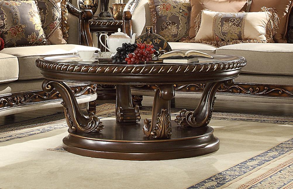 La silla de respaldo alto incluida presenta tapicería con estampado floral y detalles de tela en los brazos. Los cojines decorativos incluidos le dan el toque final perfecto. Esta mesa de centro presenta detalles tallados con un ribete clásico. La mesa está adornada con elegantes detalles tallados que aportan una sofisticación y refinamiento a la decoración.