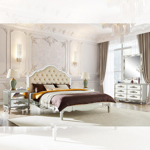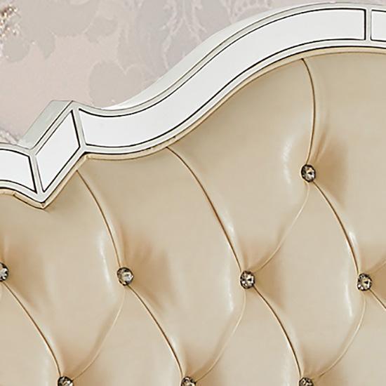 Dale un toque espectacular a tu dormitorio con la impresionante cama de plataforma Homey Design 2800. La cama cuenta con tapicería de cuero capitoné color crema en la cabecera y el pie de cama. Este conjunto incluye todos los elementos necesarios para un dormitorio: mesitas de noche, cómoda y espejo.