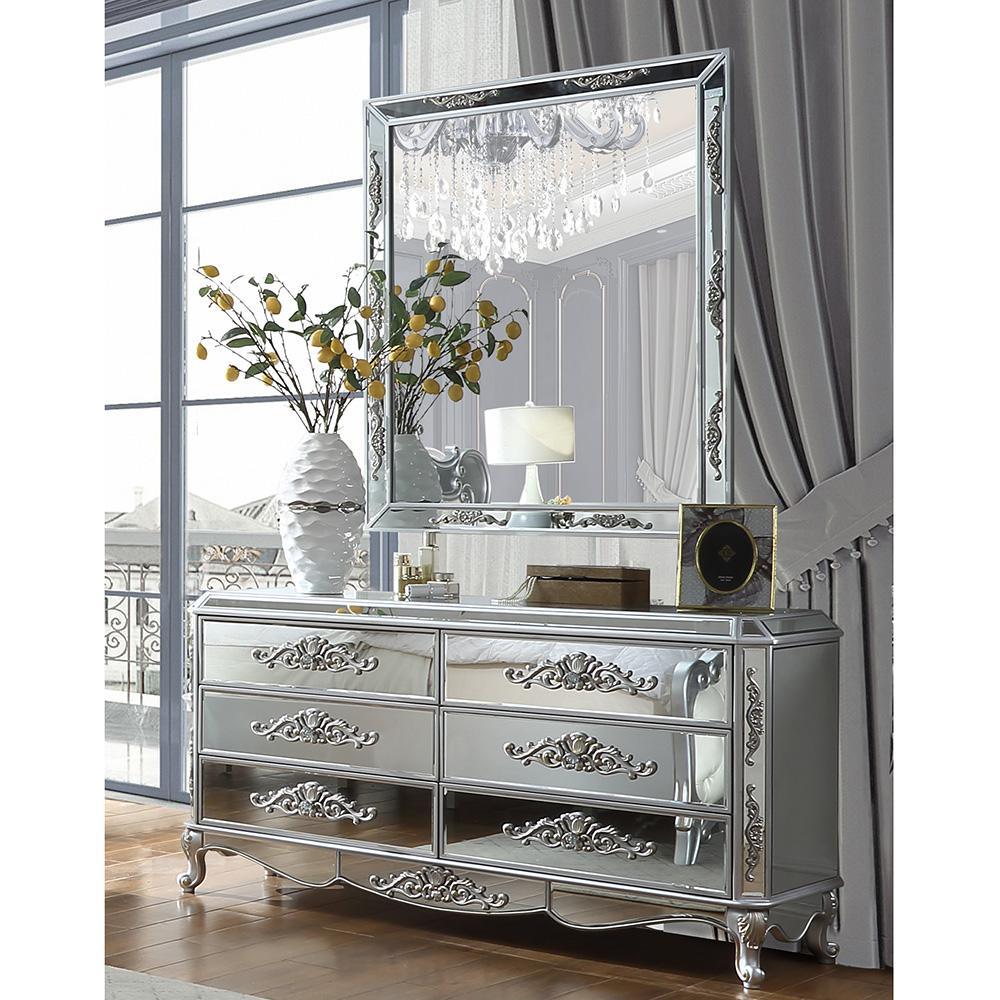 El acabado de espejo capturará la luz con belleza y creará un ambiente glamuroso y brillante en su dormitorio. Elaborado con cuidado en maderas y chapas seleccionadas, es perfecto para su dormitorio principal. Cree un ambiente impactante en su dormitorio con el estilo tradicional de esta cómoda, espejo y mesitas de noche con acabado de espejo.