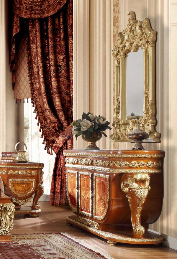 Las tallas tienen un acabado en cerezo claro y ribetes dorados que le aportan un toque de elegancia. El marco de madera de exposición define el perfil de la colección, mientras que la tapa con acabado ámbar en contraste completa el estilo. Consiga un estilo majestuoso y verdaderamente decadente en su hogar con los impresionantes diseños europeos de esta colección tradicional de Homey Design Furniture.