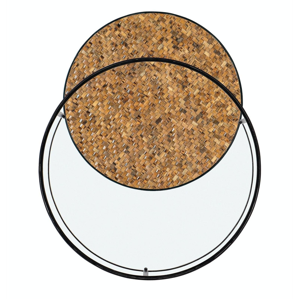 - Lo elegante se une a lo orgánico en las mesas de cóctel nido Chatham, que incluyen una mesa más grande con tapa de vidrio que revela una tapa con patrón de tejido en un acabado de madera natural en tonos tierra en la mesa más pequeña de abajo.