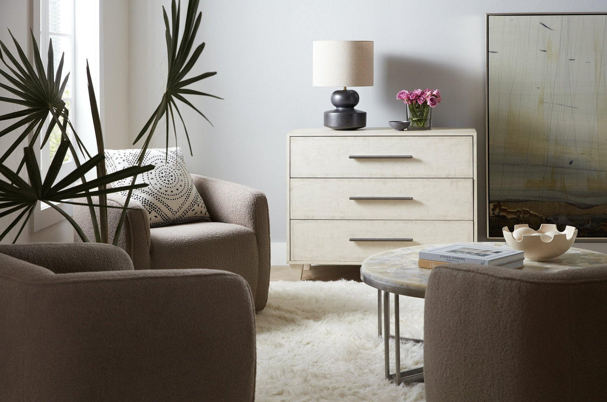 Home Elegance Furniture presenta con orgullo la cómoda de tres cajones Melange Saffron | Hooker , una incorporación refinada diseñada para realzar su hogar con un estilo atemporal.