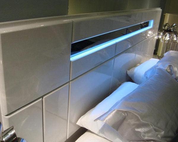 - Con líneas horizontales limpias y un cabecero iluminado,
