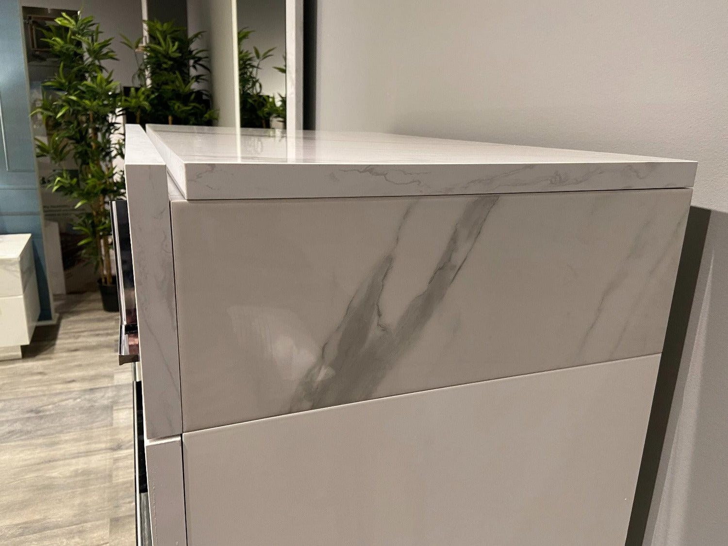 El dormitorio Sunset presenta un exclusivo acabado en mármol de Carrara, cuyo color blanco y rayas grises complementan a la perfección la laca blanca brillante. El mármol es un material de decoración muy de moda, especialmente en los estilos modernos de mediados de siglo, y aporta movimiento y riqueza a este diseño limpio y minimalista. La base plateada combina con el acabado de los tiradores, cuyo diseño se distingue por las cortas barras verticales y la unión con las líneas geométricas del cabecero. El mármol blanco, el blanco brillante y el acero inoxidable son acabados que siempre han sido los favoritos del diseño moderno.