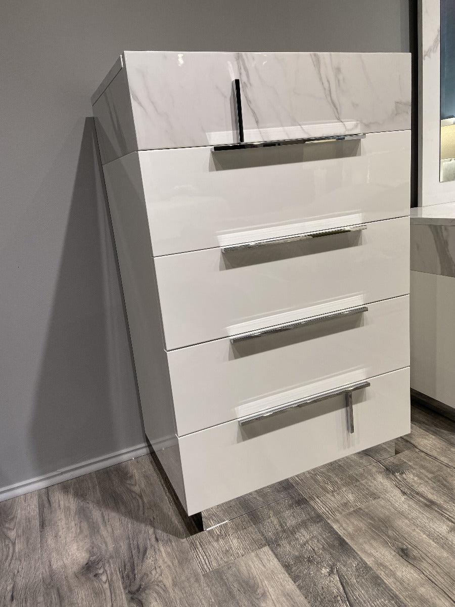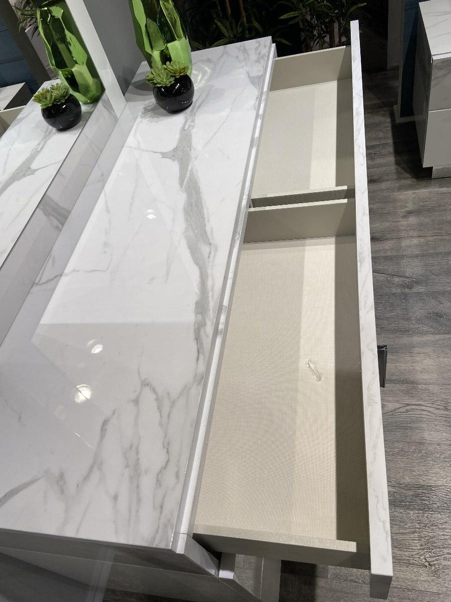 El dormitorio Sunset presenta un exclusivo acabado en mármol de Carrara, cuyo color blanco y rayas grises complementan a la perfección la laca blanca brillante. El mármol es un material de decoración muy de moda, especialmente en los estilos modernos de mediados de siglo, y aporta movimiento y riqueza a este diseño limpio y minimalista. La base plateada combina con el acabado de los tiradores, cuyo diseño se distingue por las cortas barras verticales y la unión con las líneas geométricas del cabecero. El mármol blanco, el blanco brillante y el acero inoxidable son acabados que siempre han sido los favoritos del diseño moderno.