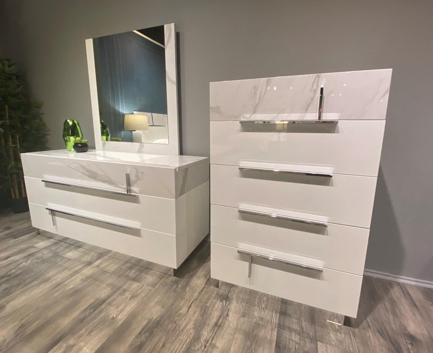 El dormitorio Sunset presenta un exclusivo acabado en mármol de Carrara, cuyo color blanco y rayas grises complementan a la perfección la laca blanca brillante. El mármol es un material de decoración muy de moda, especialmente en los estilos modernos de mediados de siglo, y aporta movimiento y riqueza a este diseño limpio y minimalista. La base plateada combina con el acabado de los tiradores, cuyo diseño se distingue por las cortas barras verticales y la unión con las líneas geométricas del cabecero. El mármol blanco, el blanco brillante y el acero inoxidable son acabados que siempre han sido los favoritos del diseño moderno.