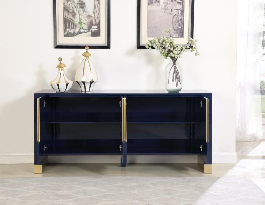 Dale un toque de distinción a tu sala de estar con el llamativo aparador/buffet Florence de Meridian Furniture. Su lacado azul marino intenso se complementa con una base con acabado dorado, creando un diseño contemporáneo, moderno y elegante. Las cuatro puertas laterales se abren para revelar cuatro compartimentos, ofreciendo amplio espacio para guardar de forma segura platos, ollas y sartenes, adornos, libros u otros artículos del hogar. La parte superior del aparador/buffet también sirve como estante para exhibir los artículos que quieras.