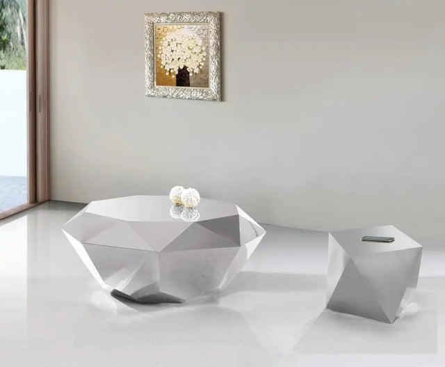 Dé una impresión impactante a la vista de todo el mundo, o al menos de sus visitas, al incorporar la mesa auxiliar Gemma Silver de Meridian Furniture a la decoración de su hogar. Esta mesa con forma de diamante está hecha de acero inoxidable cromado, lo que le otorga a su diseño contemporáneo un brillo magnífico que es difícil de pasar por alto. Úsela como pieza decorativa o como pieza central en su sala de estar y atraiga todas las miradas.