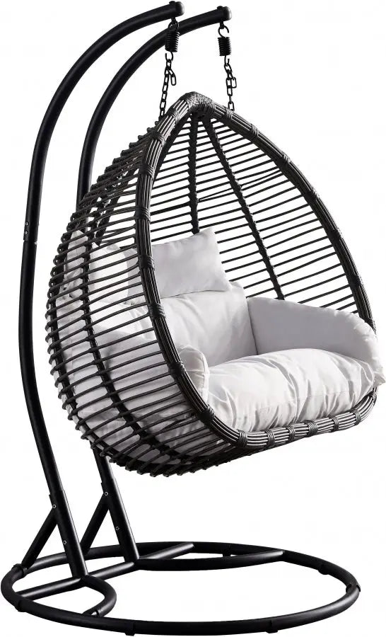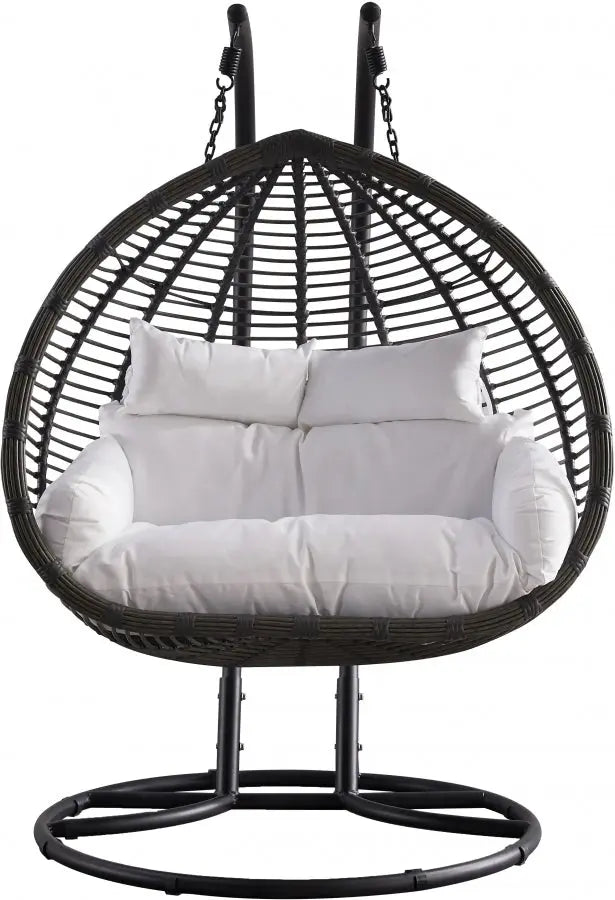Disfruta del día en la comodidad de este columpio doble Tarzan para patio. Este columpio con forma de huevo presenta un diseño de ratán gris oscuro que le da un toque lujoso a tu patio o porche, o úsalo en interiores para añadir un toque divertido a cualquier habitación. Su base de metal negro mate proporciona un soporte resistente, garantizando horas y horas de diversión y relajación. Úsalo tanto en interiores como en exteriores gracias a su resistente cojín de tela impermeable.
