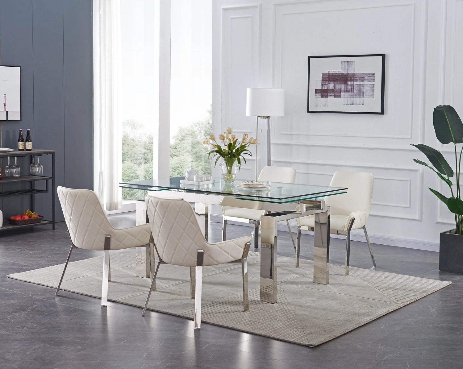 La mesa de comedor extensible Moda de J&M Furniture redefine el pragmatismo en el hogar. Cuenta con dos extensiones extraíbles a cada lado, lo que le permite transformarse en el punto focal del entretenimiento. Las patas de acero pulido complementan el mecanismo de soporte de la mesa, visible a través del tablero de cristal transparente. La combinación de acero y cristal crea una armonía de diseño, fácilmente compatible con diversos estilos de decoración.