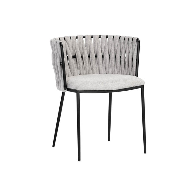 Audaz y original, este sillón de comedor contemporáneo presenta un diseño llamativo que aportará dramatismo a cualquier comedor. Cuenta con un exclusivo respaldo tejido, tapizado con nuestras telas Belfast gris koala y gris jaspeado. Se completa con una estructura de acero con recubrimiento en polvo negro y un acabado liso.