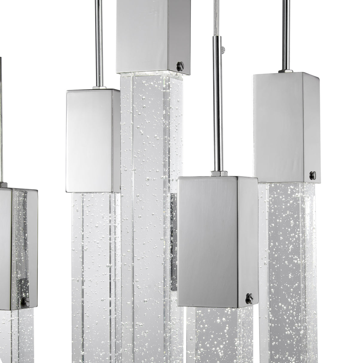 Esta lámpara de araña rectangular de cristal de cinco luces presenta un diseño superior, audaz y elegante a la vez. Sus bloques de cristal extragrandes le otorgan a esta pieza favorita de Finesse Decor un efecto dramático y elegante. Fabricada con cristal de alta gama y acabado metálico cromado, cada uno de los 13 cristales extragrandes tiene un diseño de burbujas brillantes que le confiere un aspecto lujoso y glamuroso. Sus 13 cristales extragrandes cuelgan de un dosel cuadrado de 30 x 30 cm. Esta lámpara de araña rectangular de cristal de cinco luces es la pieza perfecta para añadir un toque de decadencia a tu espacio. Colgada sobre tu mesa de comedor o recibidor, ¡esta lámpara será sin duda el centro de atención en cualquier espacio que elijas!