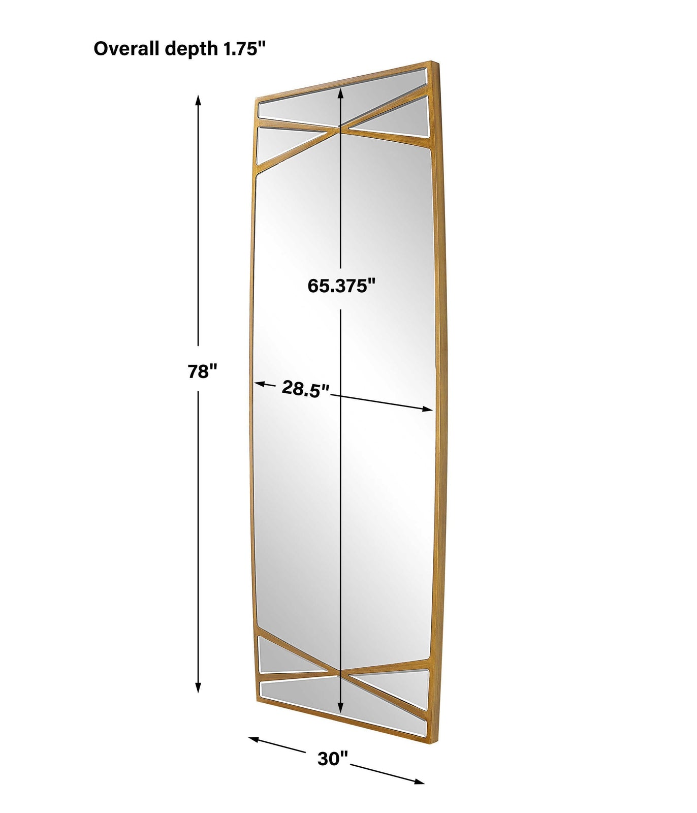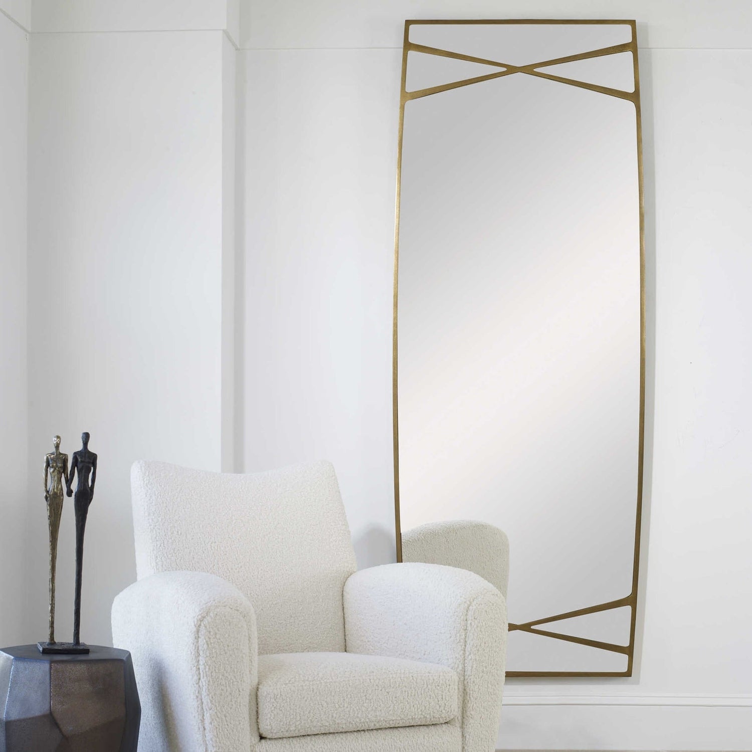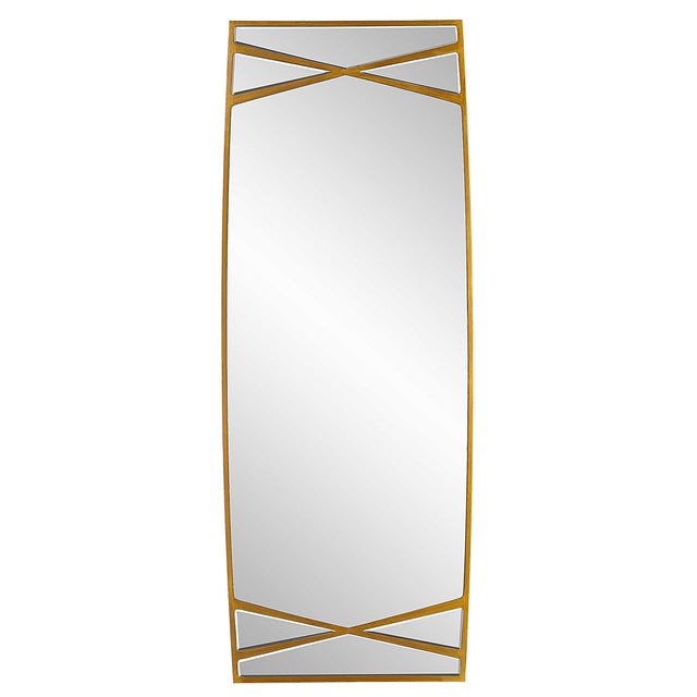 - Este espejo de gran tamaño, que sin duda dejará una impresión elegante, presenta una silueta curva en un acabado dorado antiguo con detalles cruzados.