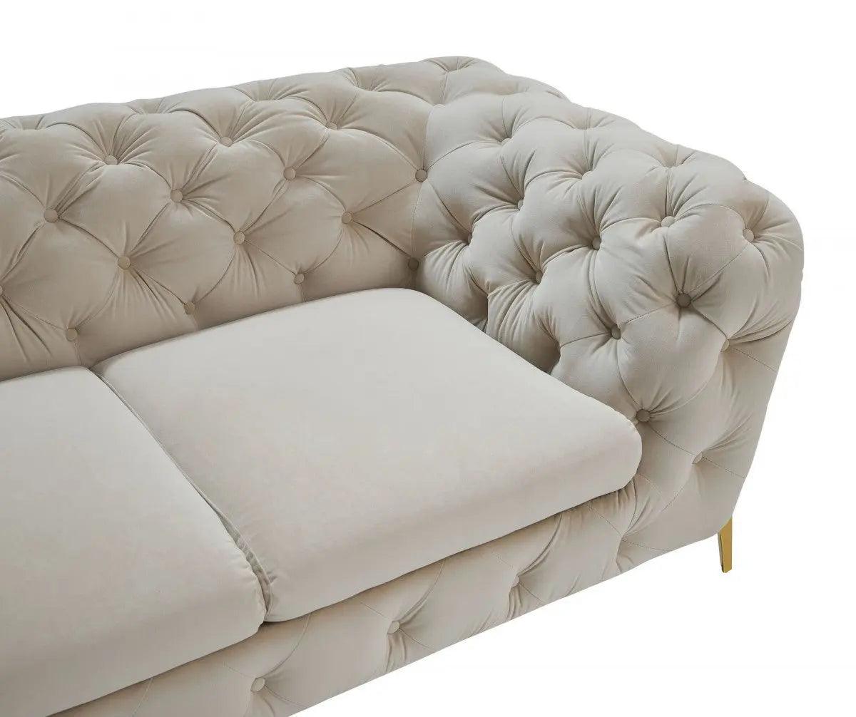 La silla Quincey Beige es una hermosa pieza de transición y glamour que se adapta a diferentes estilos de decoración: glam, transicional y contemporáneo. Está tapizada en terciopelo beige, con respaldo y brazos mullidos estilo esmoquin con capitoné con botones de diamante, y patas doradas pulidas que se extienden hacia arriba, creando un elemento de diseño único. Combina con el sofá de tres plazas y el loveseat de dos plazas.