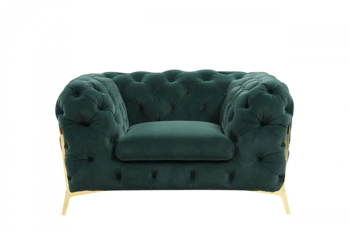 La silla Sheila Green es una hermosa pieza de transición y glamour que se adapta a diferentes estilos de decoración: glam, transicional y contemporáneo. Está tapizada en terciopelo verde, con respaldo y brazos mullidos estilo esmoquin con capitoné con botones de diamante, y patas doradas pulidas que se extienden hacia arriba, creando un elemento de diseño único. Combina con el sofá de tres plazas y el loveseat de dos plazas.