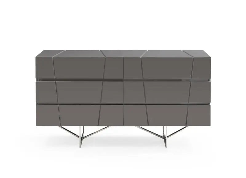 La cómoda moderna Modrest Chrysler gris mantiene tu dormitorio funcional y organizado. Equipada con 6 amplios cajones de fácil deslizamiento, presenta hendiduras angulares en los frentes y la parte superior para un look moderno. Con un acabado gris brillante, esta cómoda moderna reposa sobre elegantes patas cuadradas y triangulares de acero inoxidable pulido.