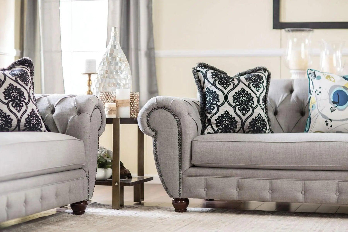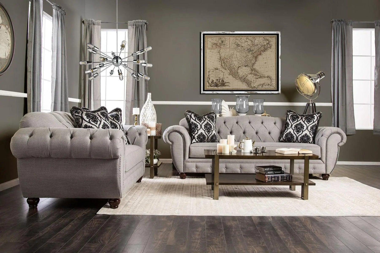 Sofá y loveseat de transición Viviana en tela gris imitación lino de Furniture of America