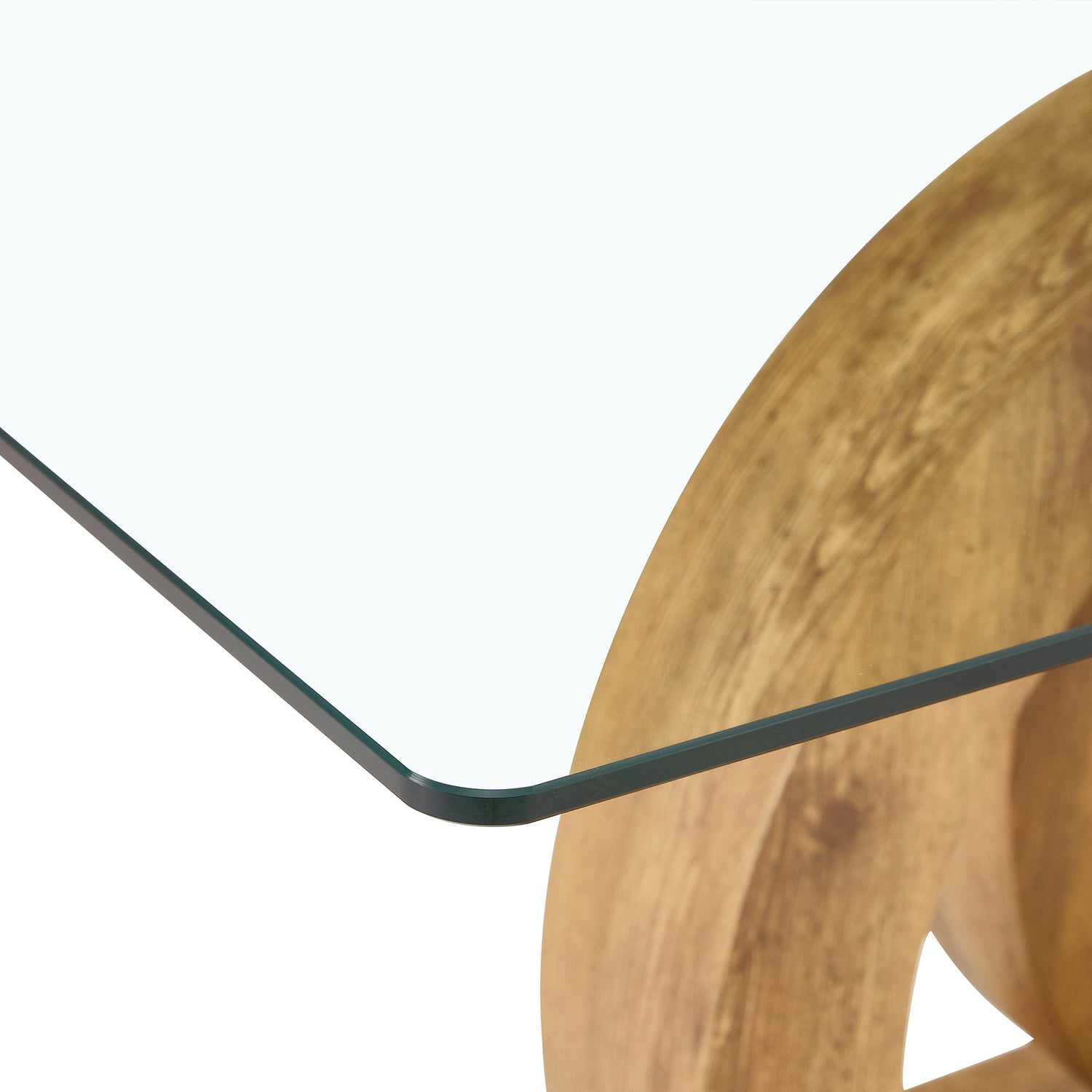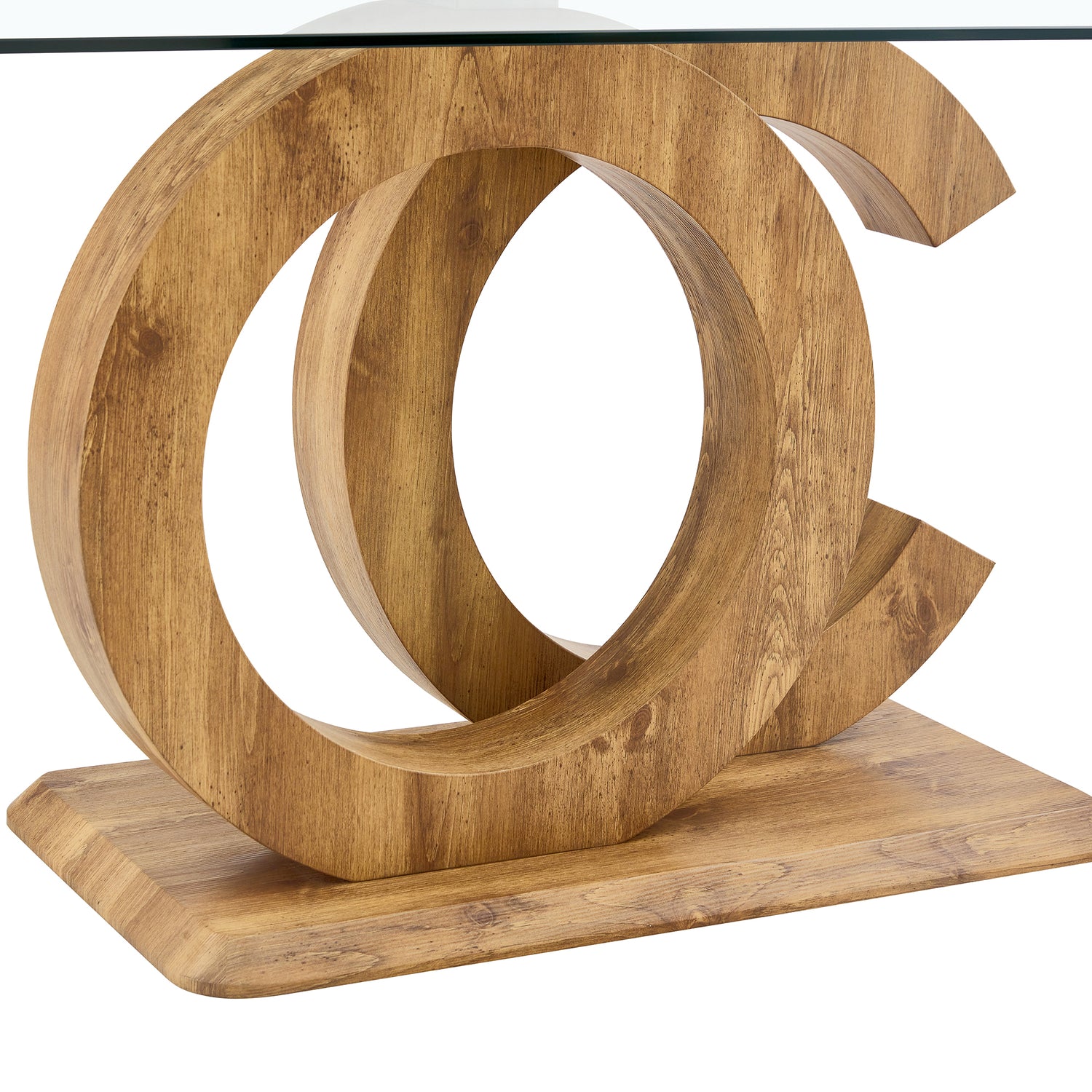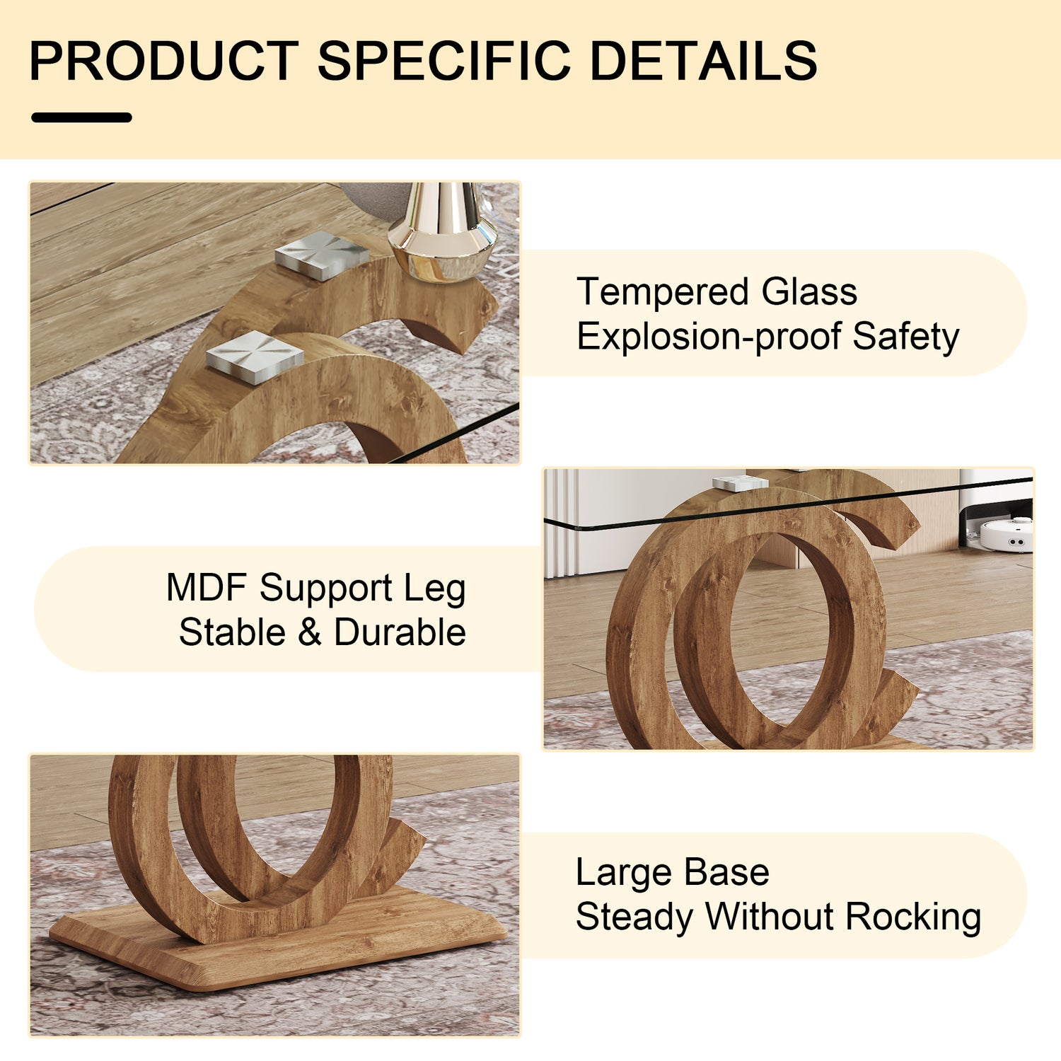 - Clear Tempered Glass Top: Offers a transparent visual effect, enhancing the sense of space, while providing the safety and durability of tempered glass.Unique OC-Shaped Design: The legs are made of wood color MDF with an OC-shaped design that is not only stable but also features a distinctive modern aesthetic.The wooden MDF legs of the table add a touch of natural atmosphere to your home.
