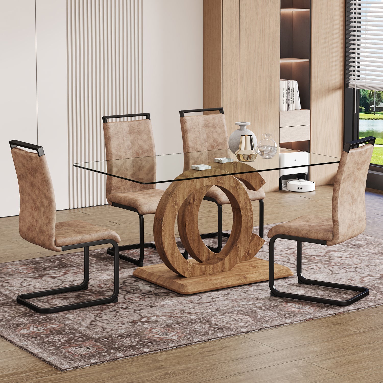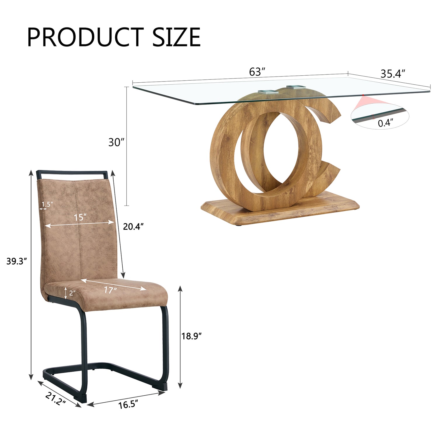 1 table and 4 chairs set.63'x35.4x30' Transprant Tempered glass Dining Tabletop with Wood color MDF OC shaped bracket.Paired with 4 brown technology fabric chairs.W1151S02016