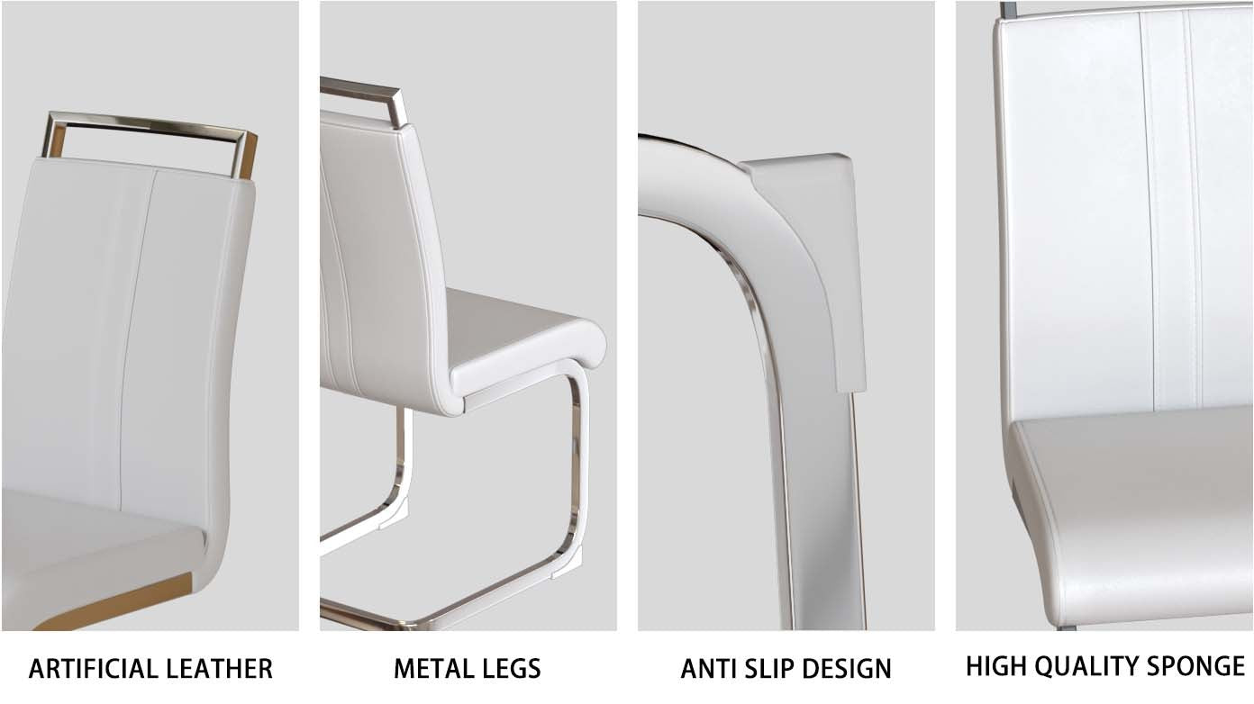 - 8.Durable and sturdy: The sturdy white leather dining chair is equipped with a C-shaped silver plated base, creating a unique modern appearance. The bottom has scratch resistant plastic feet to prevent damage to the floor.