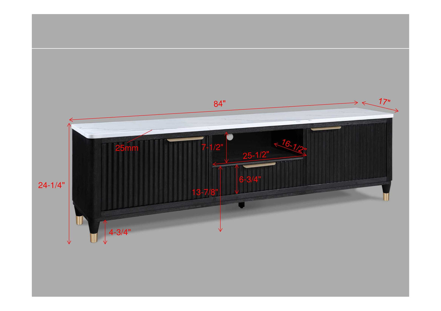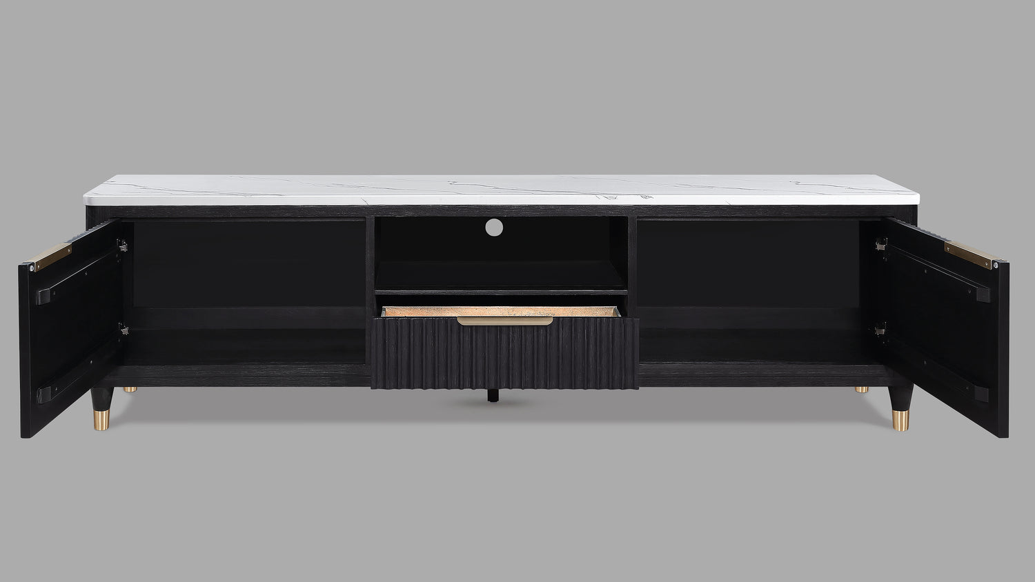 Description:- This entertainment console brings modern luxury and sleek sophistication to any living space. Featuring a striking contrast of a black, fluted wood facade with a pristine white faux marble top, this piece embodies refined elegance. Brass-tone accents and tapered legs add a touch of mid-century flair, enhancing its chic, upscale appeal. With generous storage space behind its textured doors and an open center shelf for easy access to media components, this console is as functional as it is stylish. Ideal for contemporary interiors, it’s the perfect blend of high-end design and everyday practicality, making it a standout addition to your home decor.
