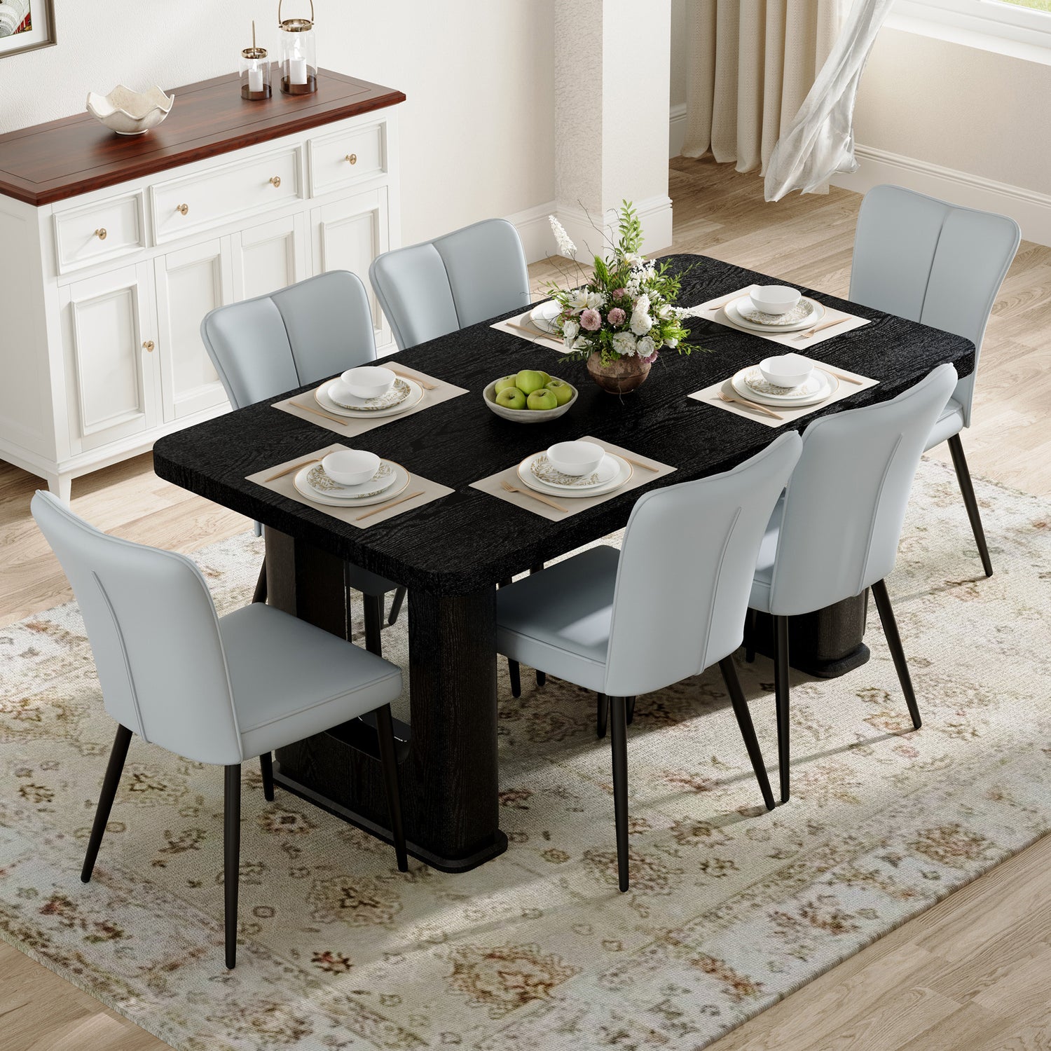 Table and chair set.64.5 x 35.4 Inch Stylish Black Wood Color Textured Dining Table.Paired with 6 Light Gray PU chairs with a vertical stripe design on the backrest and black metal legs.