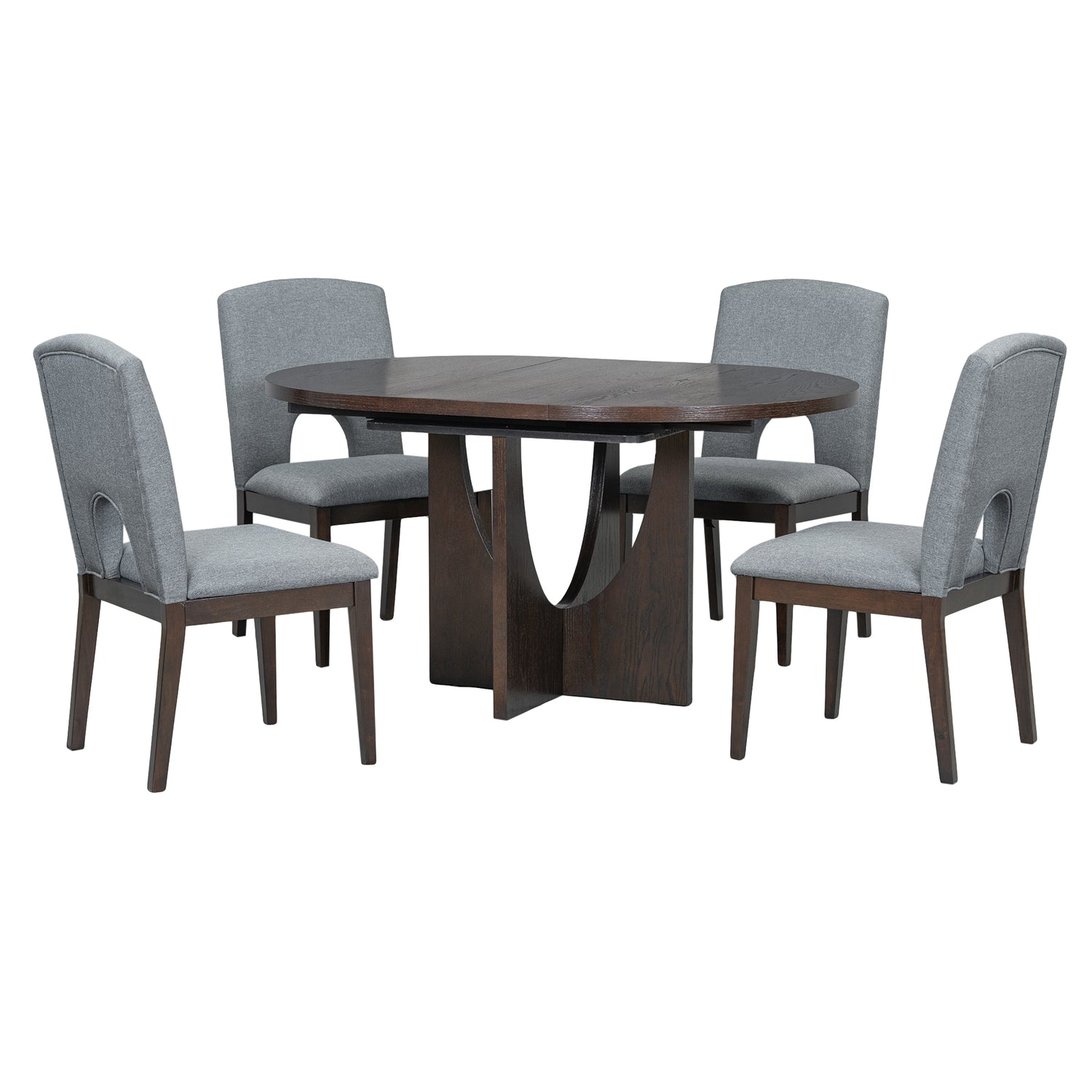 TOPMAX Modern 5-Piece Extendable Round Dining Table Set with Removable Leaf, Espresso+Gray, Solid Wood
