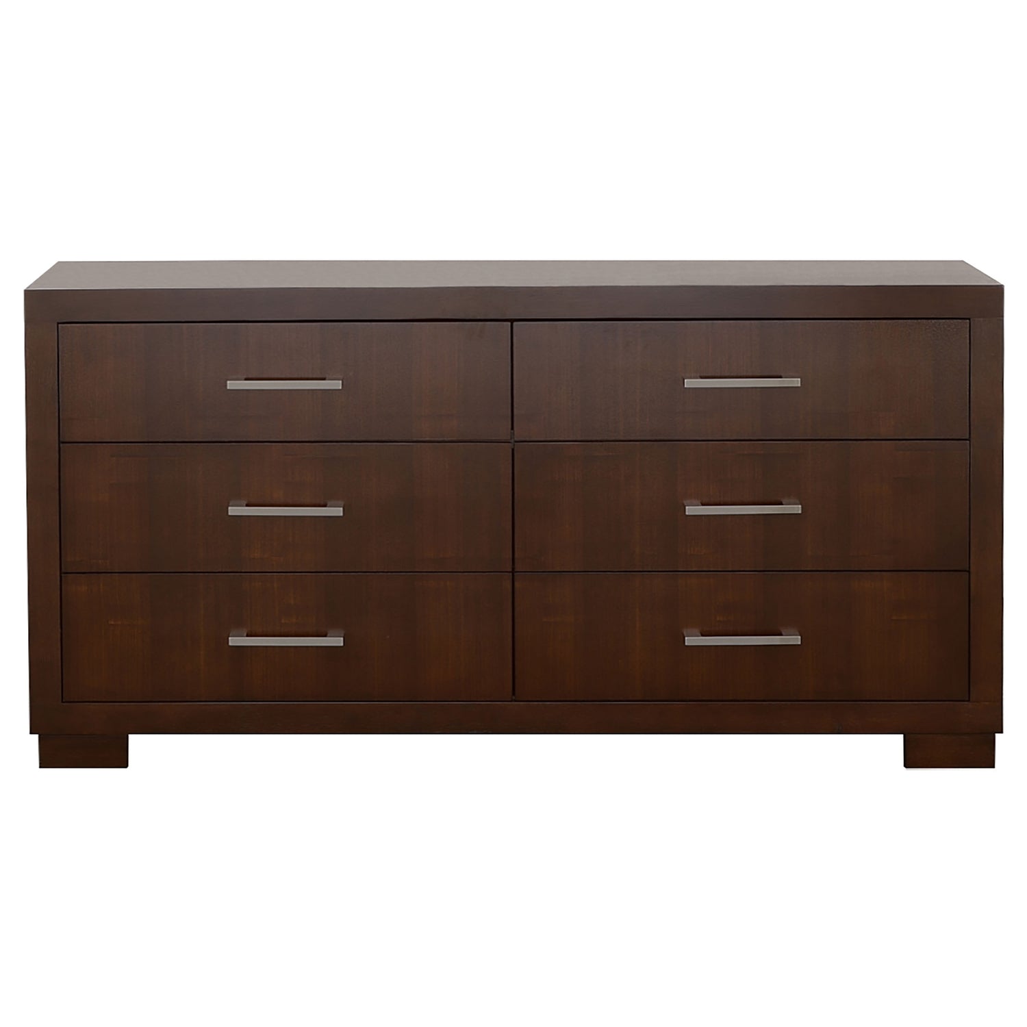 - Silver-tone bar handles on drawers enhance functionality while adding a sophisticated metallic accent to the design