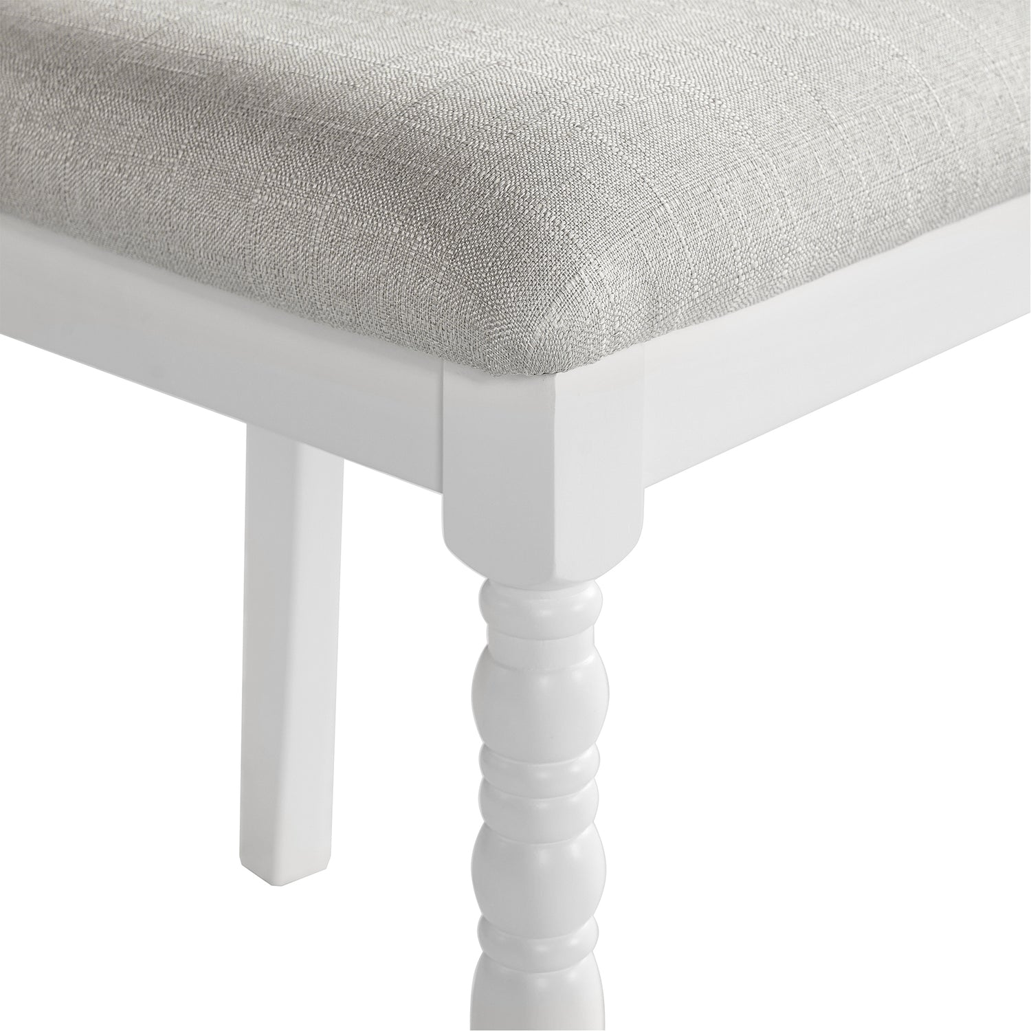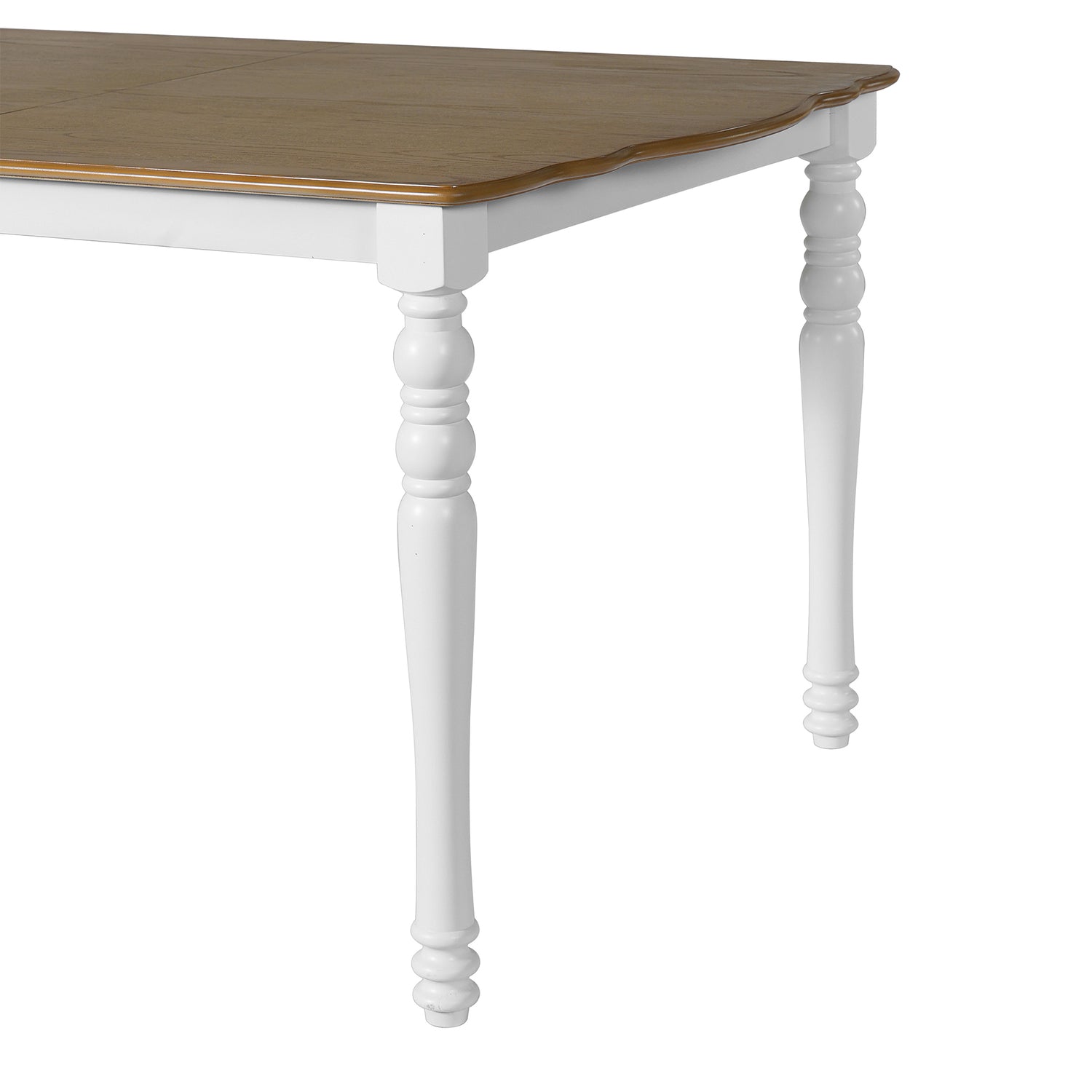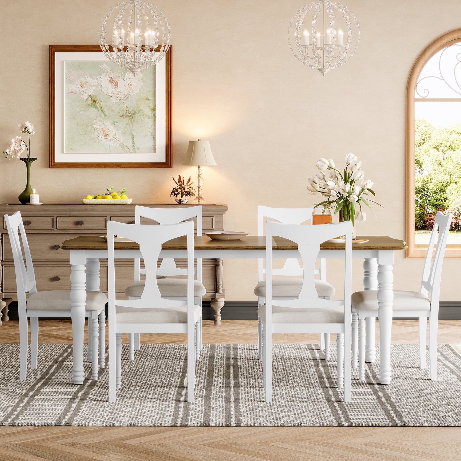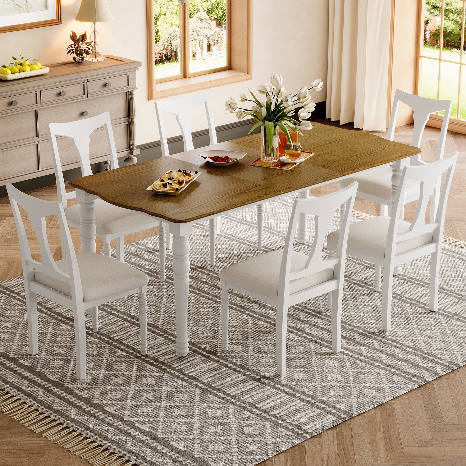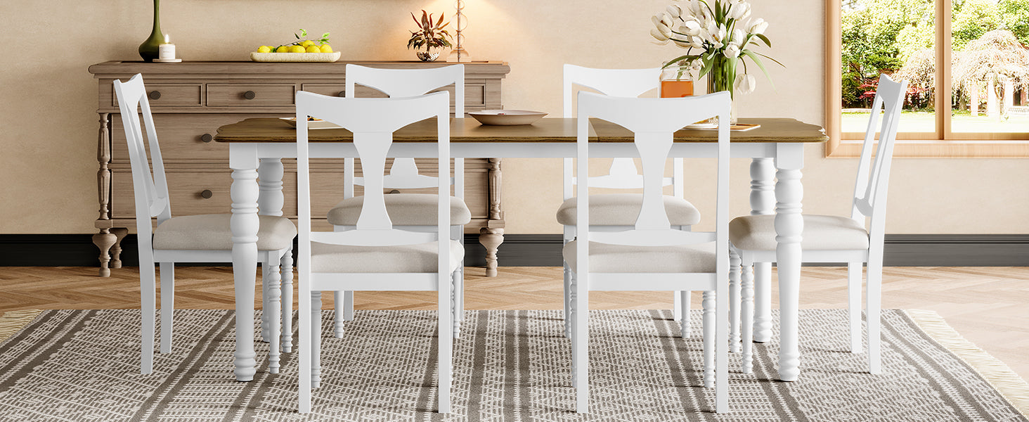 - 2 Colors: 1. Classic brown and black model, the tabletop presents warm brown oak texture, with calm black table and chair legs, beige cushion embellishment, creating a traditional warm country style. 2. Original white model, the tabletop presents natural oak texture, with pure white table and chair legs, beige cushion adds a sense of brightness, to create a fresh, modern and full of rustic atmosphere of the dining space. The whole dining space is full of fresh, modern and rustic flavor