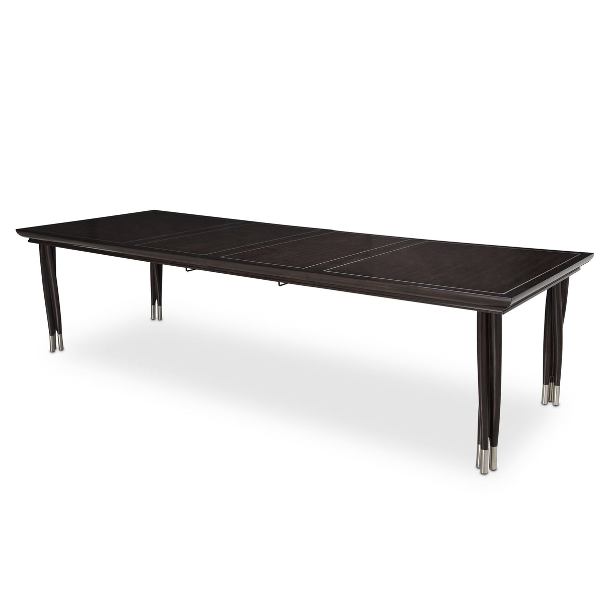 From the Paris Chic Collection, this dining set showcases artisan details like vine-twisted ballerina legs, brushed nickel foot bases, and platinum-finished trim. The table includes two 24-inch self-storing leaves, allowing you to extend the length from 74 inches to 122 inches for hosting larger gatherings without sacrificing style.