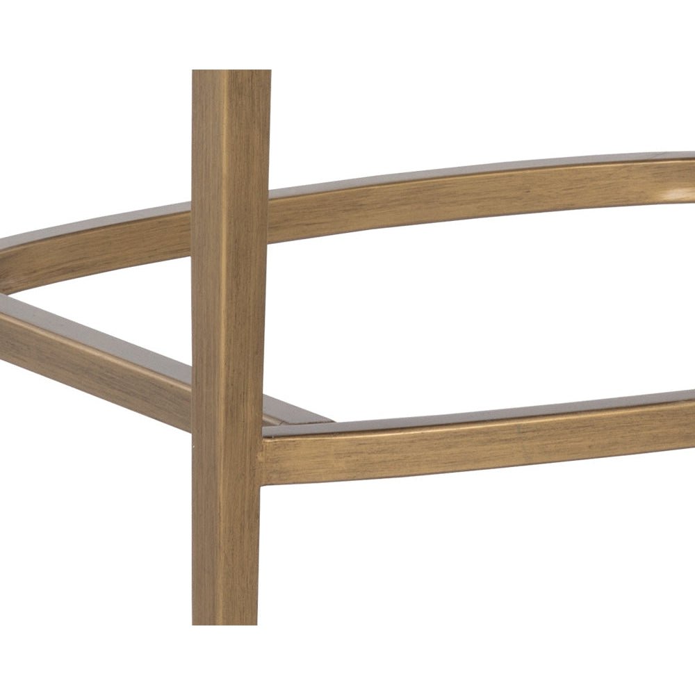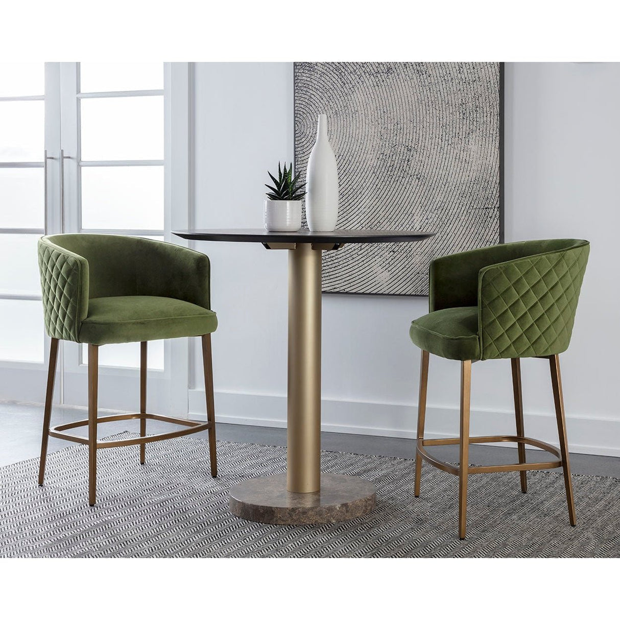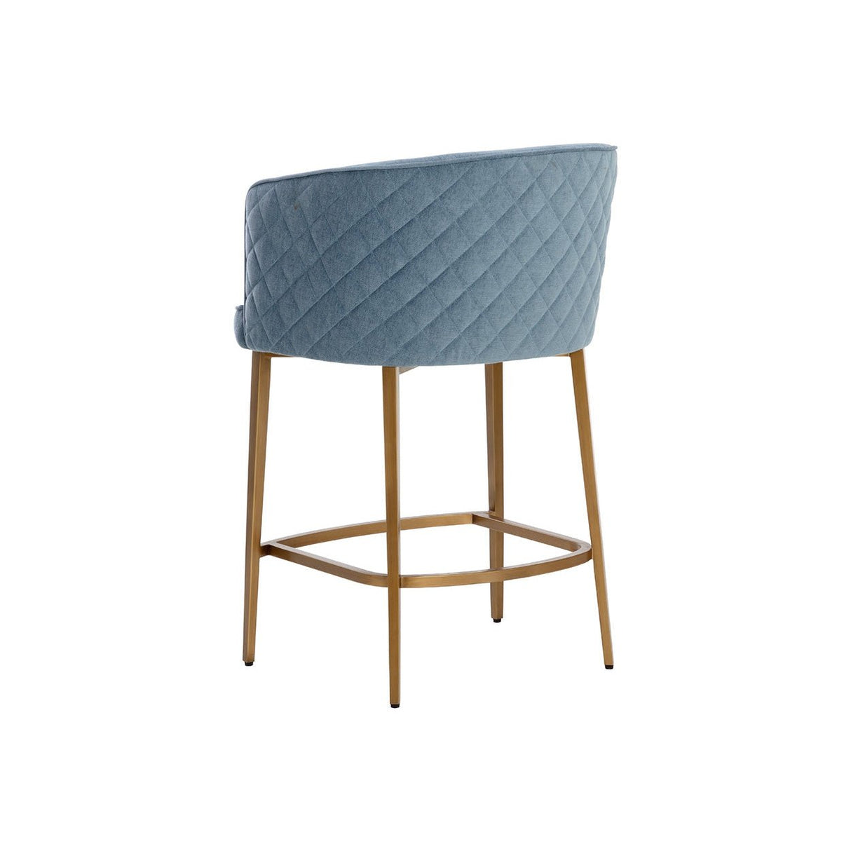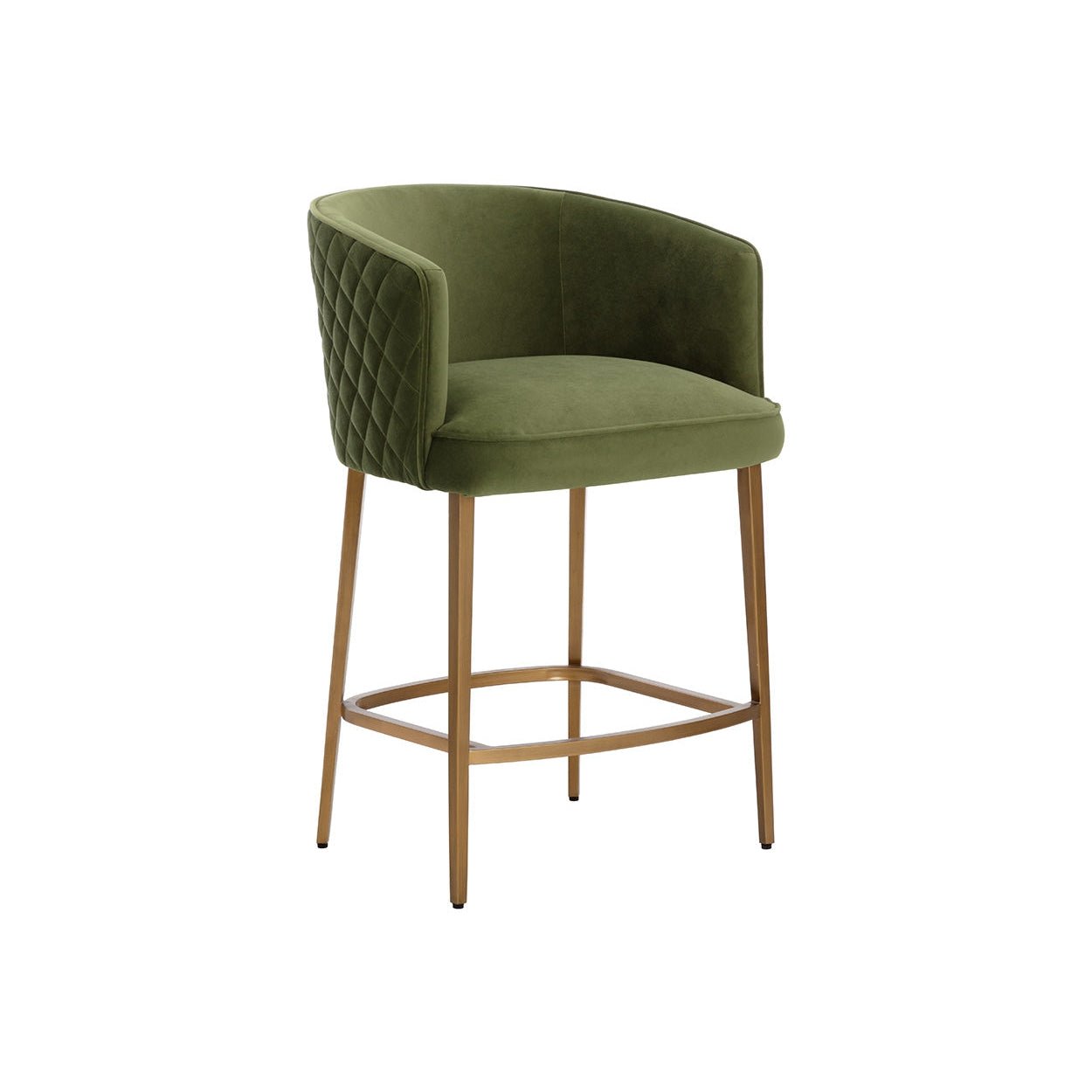 Feminine flair comes to life in this modern counter stool. Stocked in meg olive fabric with elegant diamond stitching on the exterior seatback. An antique brass steel frame completes the look. Also available in danny iceberg and polo club stone fabrics.