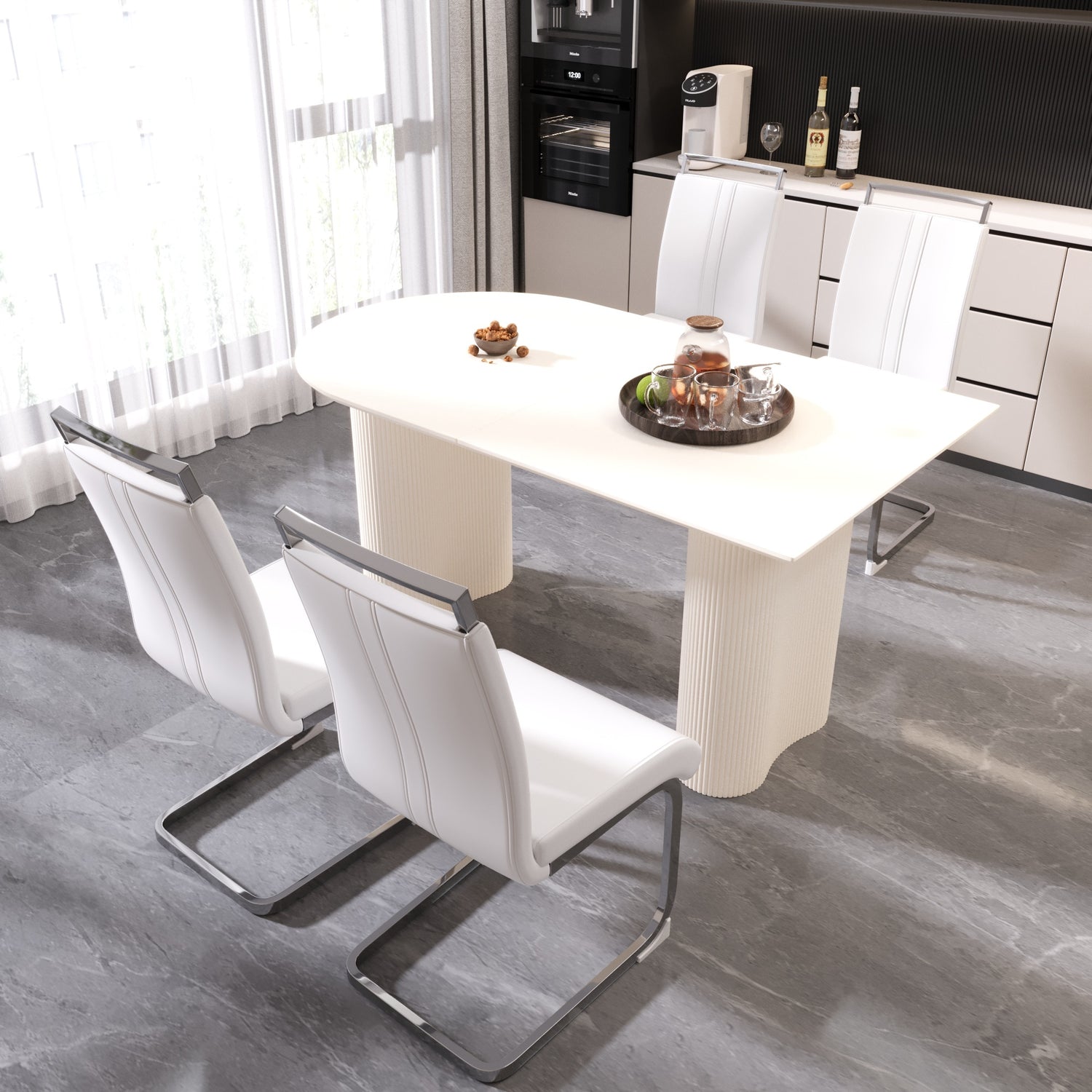 - 2.5-piece dining table and chair set: A table that can accommodate 4-8 guests for gatherings and four ergonomically designed leather modern style armless dining chairs, creating a fashionable focus for you in the dining area.
