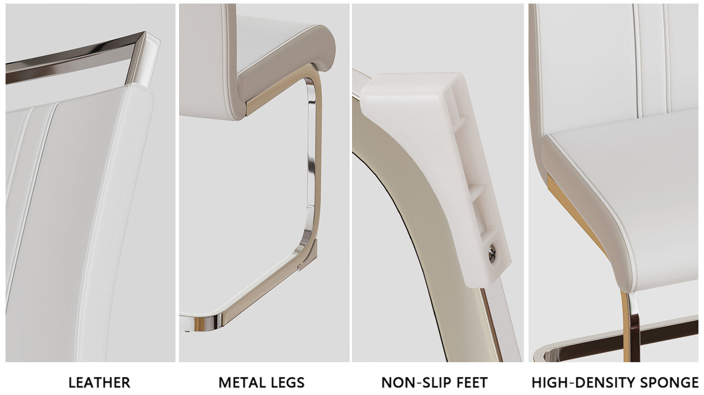 - 8.Durable and sturdy: The sturdy white leather dining chair is equipped with a C-shaped silver plated base, creating a unique modern appearance. The bottom has scratch resistant plastic feet to prevent damage to the floor.