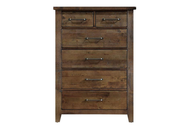 Classic transitional design serves as a base for the natural qualities of the solid wood utilized to create the rustic look of the Jerrick Collection. Metal hardware furthers the authentic rustic look of the chest while a burnished finish serves to highlight the solid wood grain while allowing each plank to serve as a unique accent to the overall design.