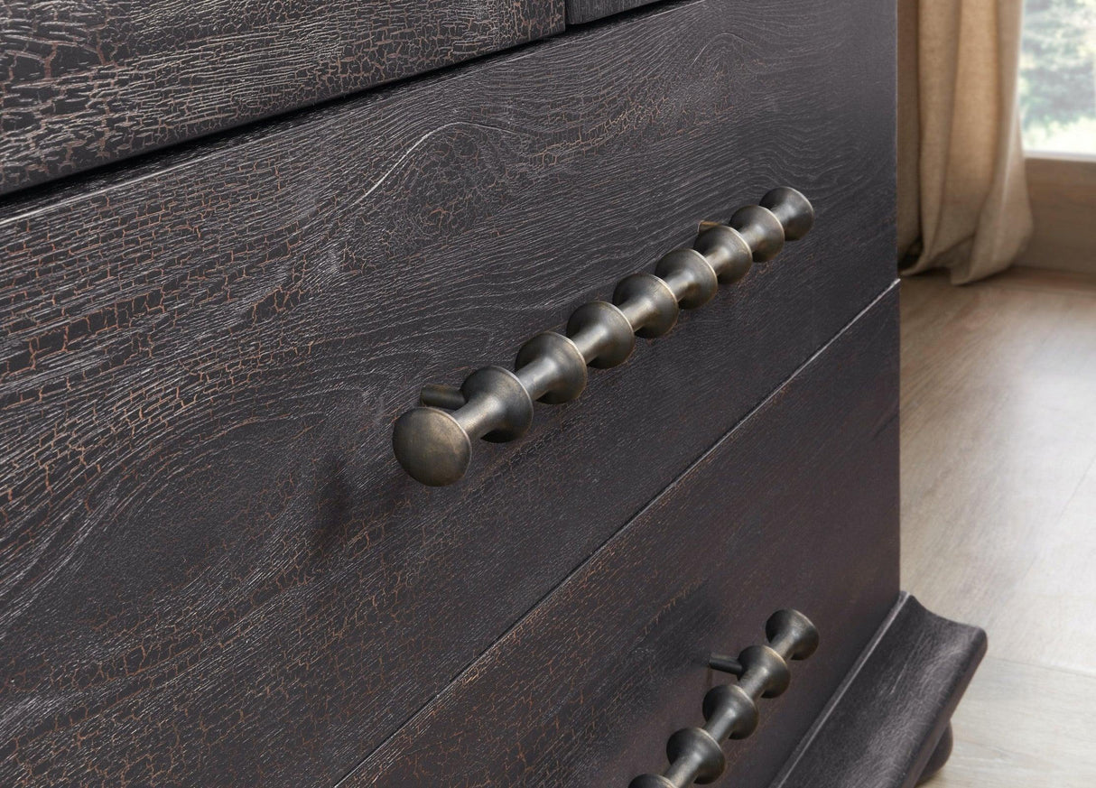 Behind the two doors, you’ll find functional storage including one removable clothes rod, two adjustable shelves, and four self-closing drawers. With its balanced blend of rugged texture and timeless craftsmanship, this compact wardrobe brings a grounded sense of style to any bedroom or dressing area.