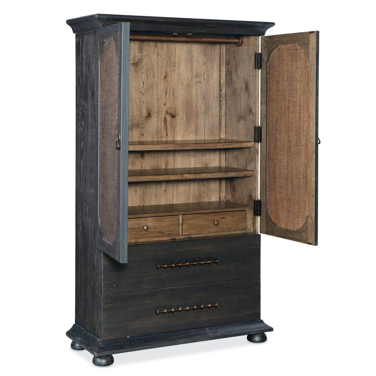 Capture the rugged charm of the wilderness with the Big Sky Small Wardrobe by Hooker Furniture. This rustic armoire features a dramatic Charred Timber finish over Pecky Hickory Veneers, paired with textured burlap inlay doors for a striking contrast. The piece rests on classic bun feet and is accented with dark brushed bronze hardware.
