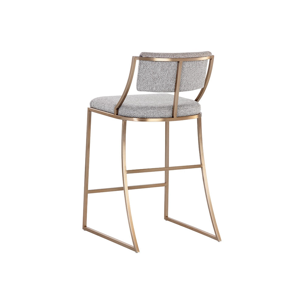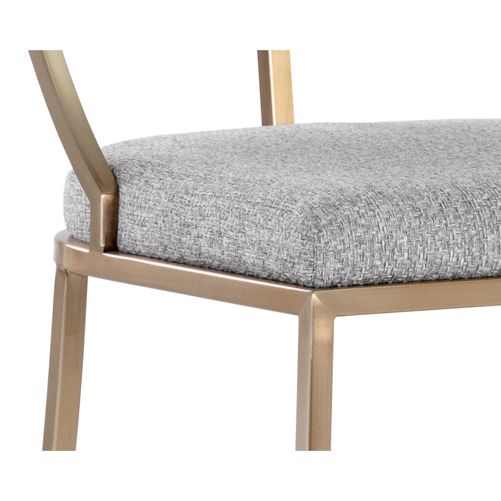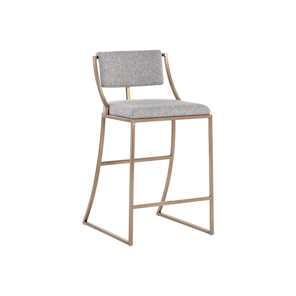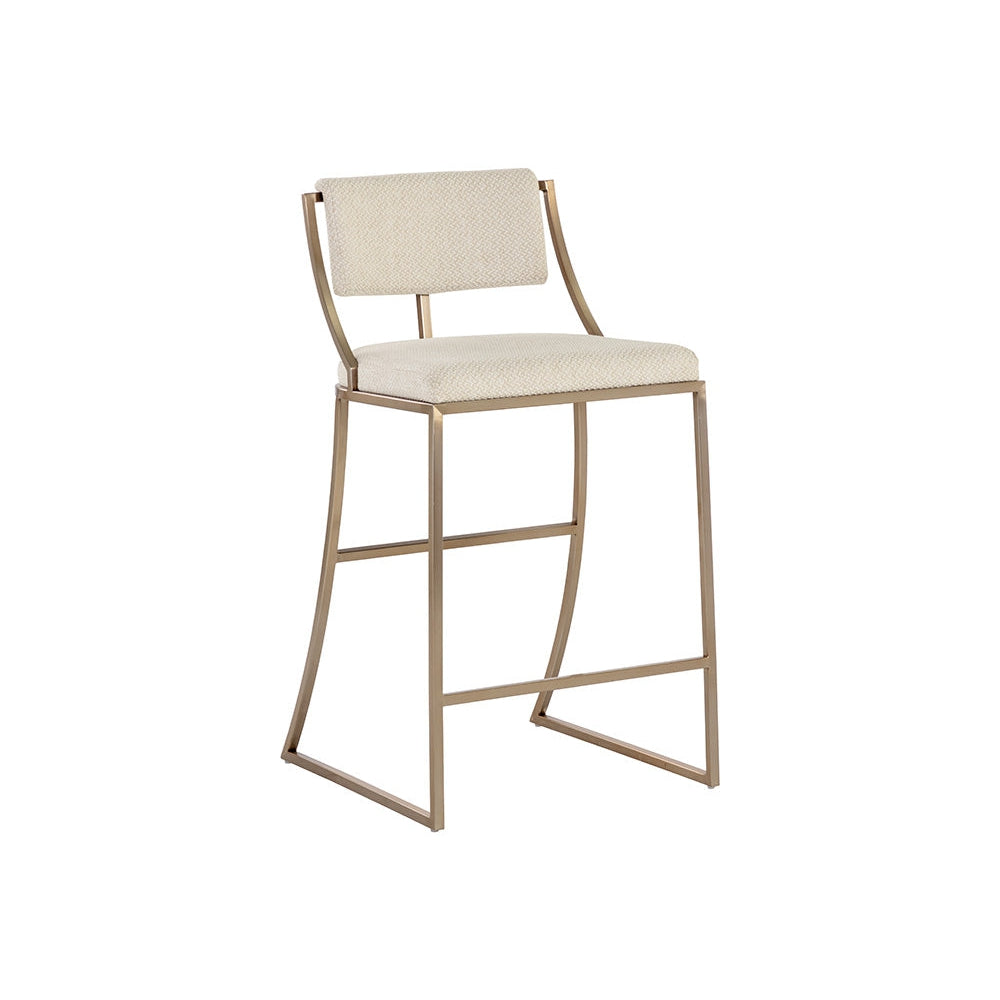 Sleek with an urban design, this counter stool emulates a beautiful mid-century design. Upholstered in monument pebble and oatmeal fabrics, and completed with an antique brass stainless steel frame. Also available in a dining chair version.