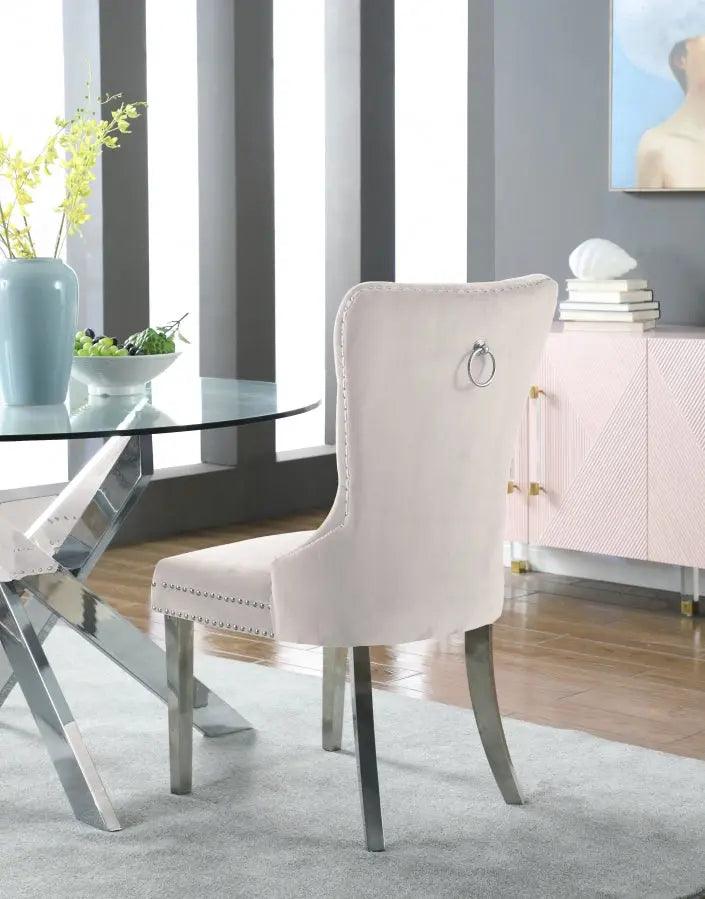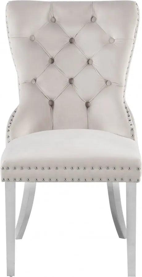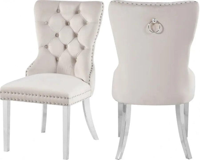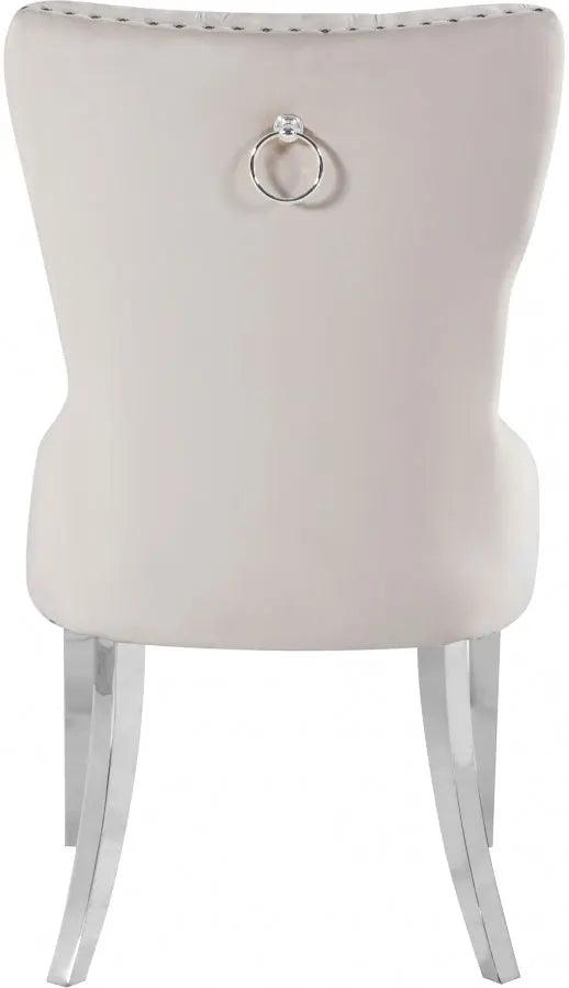 Transform your living space into a chic haven with this Carmen Cream Velvet Dining Chair. This eye-catching high-back chair offers plenty of back support, while its luxurious black velvet upholstery and deep button tufting provides a soft texture, enabling you to recline in comfort and elegance. Chrome metal legs provide sturdy, durable support, and a matching chrome knocker on the chair's back gives it a unique, stylish touch that adds that extra bit of oomph to your contemporary home.