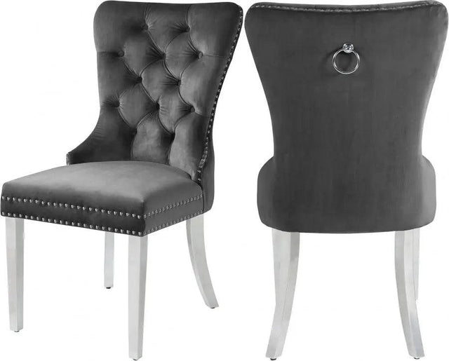 Transform your living space into a chic haven with this Carmen Grey Velvet Dining Chair. This eye-catching high-back chair offers plenty of back support, while its luxurious black velvet upholstery and deep button tufting provides a soft texture, enabling you to recline in comfort and elegance. Chrome metal legs provide sturdy, durable support, and a matching chrome knocker on the chair's back gives it a unique, stylish touch that adds that extra bit of oomph to your contemporary home.