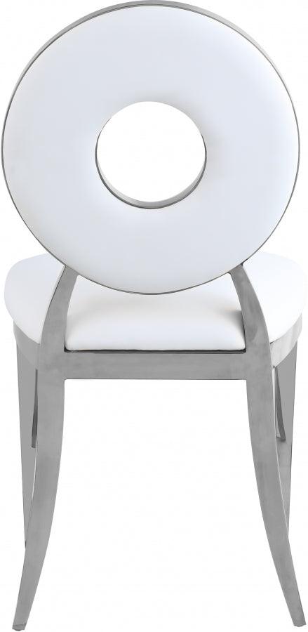 Yield to the decorator within when you bring home this Carousel faux leather dining chair. This chair features a metal frame and legs finished in chrome stainless steel for a modern touch, but the real star of the show is the donut-shaped seat back that exudes undeniable contemporary charm. The seat and back are both plumply filled for comfort and upholstered in soft white faux leather for a chic look.